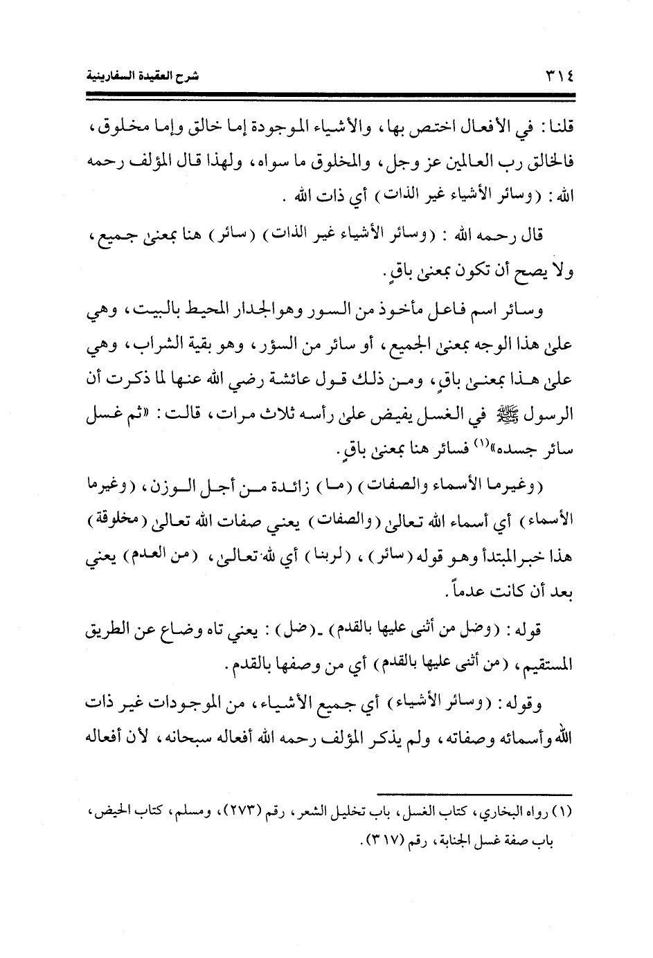 قلنا: في الأفعال اختص بها، والأشياء الموجودة إما خالق وإما مخلوق، فالخالق رب العالمين عز وجل، والمخلوق ما سواه، ولهذا قال المؤلف رحمه الله: (وسائر الأشياء غير ذات) أي ذات الله.