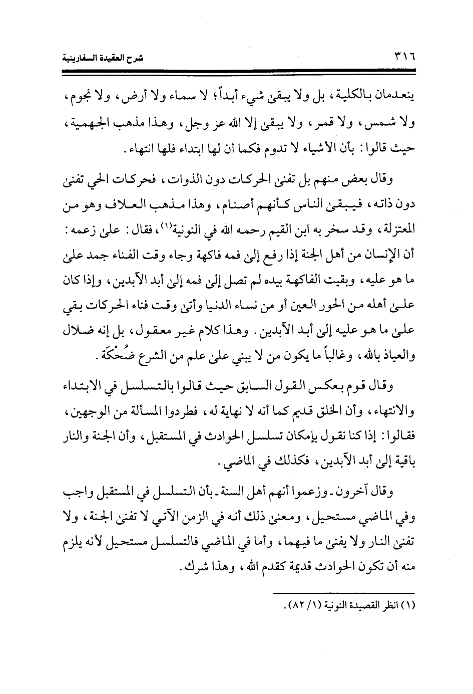 وقال بعض منهم بل تفنى الحركات دون الذوات، فحركات الحي تفنى دون ذاته، فيبقى الناس كأنهم أصنام، وهذا مذهب العلاف وهو من المعتزلة، وقد سخر به ابن القيم رحمه الله في النونية (¬1) ، فقال: على زعمه: أن الإنسان من أهل الجنة إذا رفع إلى فمه فاكهة وجاء وقت الفناء جمع على ما هو عليه، وبقيت الفاكهة بيده لم تصل إلى فمه إلى أبد الآبدين، وإذا كان على أهله من الحور العين أو من نساء الدنيا وأتى وقت فناء الحركات بقي على ما هو عليه إلى أبد الآبدين. وهذا كلام غير معقول، بل أنه ضلال والعياذ بالله، وغالباً ما يكون من لا يبني على علم من الشرع ضحكة.