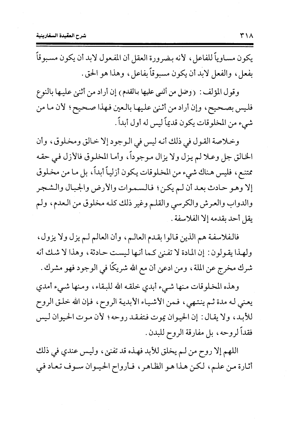 وقول المؤلف: (وضل من أثنى عليها بالقدم) إن أراد من أثنى عليها بالنوع فليس بصحيح، وإن أراد من أثنى عليها بالعين فهذا صحيح؛ لأن ما من شيء من المخلوقات يكون قديما ليس له أول أبدا.