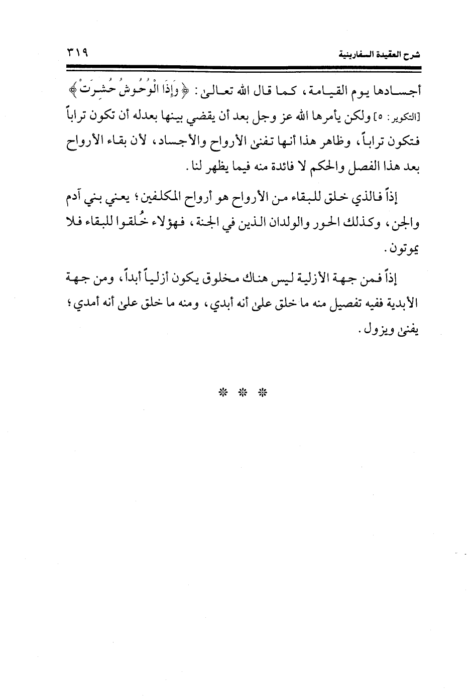 أجسادها يوم القيامة، كما قال الله تعالى: (وَإِذَا الْوُحُوشُ حُشِرَتْ) (التكوير: 5) ولكن يأمرها الله عز وجل بعد أن يقضي بينها بعدله أن تكون ترابا فتكون ترابا، وظاهر هذا أنها تفنى الأرواح والأجساد، لأن بقاء الأرواح بعد هذا الفصل والحكم لا فائدة منه فيما يظهر لنا.