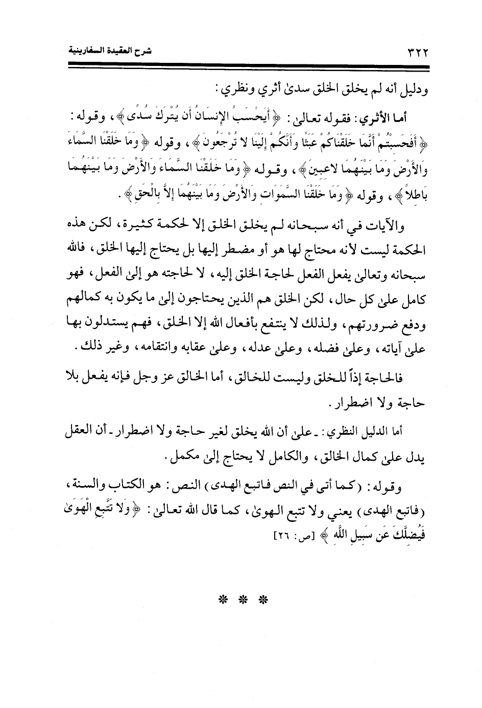أما الأثري: فقوله تعالى (أَيَحْسَبُ الإنسان أَنْ يُتْرَكَ سُدىً) (القيامة: 36) ، وقوله: (أَفَحَسِبْتُمْ أَنَّمَا خَلَقْنَاكُمْ عَبَثاً وَأَنَّكُمْ إِلَيْنَا لا تُرْجَعُونَ) (المؤمنون: 115) ، وقوله (وَمَا خَلَقْنَا السَّمَاءَ وَالْأَرْضَ وَمَا بَيْنَهُمَا لاعِبِينَ) (الأنبياء: 16) ، وقوله (وَمَا خَلَقْنَا السَّمَاءَ وَالْأَرْضَ وَمَا بَيْنَهُمَا بَاطِلاً) (صّ: الآية 27) ، وقوله (وَمَا خَلَقْنَا السَّمَوَاتِ وَالْأَرْضَ وَمَا بَيْنَهُمَا إِلَّا بِالْحَقّ) (الحجر: الآية 85) .