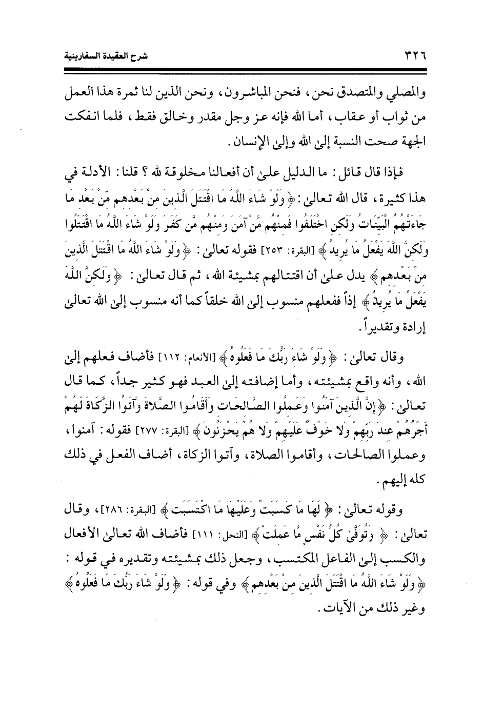 وقوله تعالى: (لَهَا مَا كَسَبَتْ وَعَلَيْهَا مَا اكْتَسَبَتْ) (البقرة: الآية 286) ، وقال تعالى: (وَتُوَفَّى كُلُّ نَفْسٍ مَا عَمِلَت) (النحل: الآية 111) فأضاف الله تعالى الأفعال والكسب إلى الفاعل المكتسب، وجعل ذلك بمشيئته وتقديره في قوله: (وَلَوْ شَاءَ اللَّهُ مَا اقْتَتَلَ الَّذِينَ مِنْ بَعْدِهِمْ) وفي قوله: (وَلَوْ شَاءَ رَبُّكَ مَا فَعَلُوهُ) وغير ذلك من الآيات.