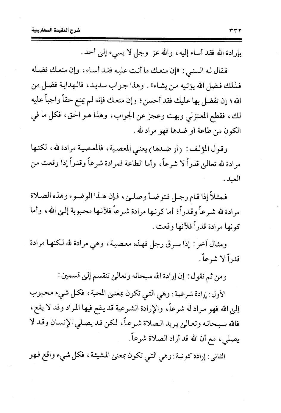 الأول: إرادة شرعية: وهي التي تكون بمعنى المحبة، فكل شيء محبوب إلى الله فهو مراد له شرعاً، والإرادة الشرعية قد يقع فيها المراد وقد لا يقع، فالله سبحانه وتعالى يريد الصلاة شرعاً، لكن قد يصلي الإنسان وقد لا يصلي، مع أن الله قد أراد الصلاة شرعاً.