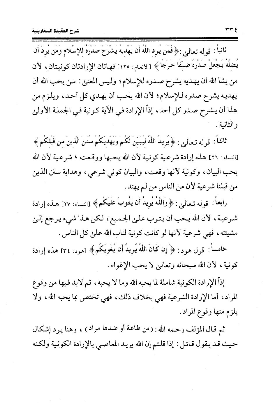 ثالثاً: قوله تعالى: (يُرِيدُ اللَّهُ لِيُبَيِّنَ لَكُمْ وَيَهْدِيَكُمْ سُنَنَ الَّذِينَ مِنْ قَبْلِكُمْ) (النساء: الآية 26) هذه إرادة شرعية كونية لأن الله يحبها ووقعت؛ شرعية لأن الله يحب البيان، وكونية لأنها وقعت، والبيان كوني شرعي، وهداية سنن الذين من قبلنا شرعية لأن من الناس من لم يهتد.