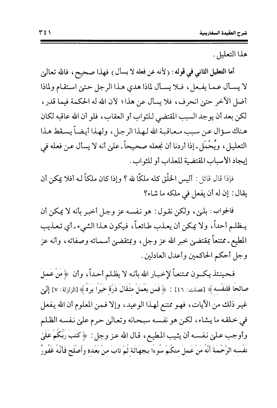 أما التعليل الثاني في قوله: (لأنه عن فعله لا يسأل) فهذا صحيح، فالله تعالى لا يسأل عما يفعل، فلا يسأل لماذا هدي هذا الرجل حتى استقام ولماذا أضل الآخر حتى انحرف، فلا يسأل عن هذا؛ لأن الله له الحكمة فيما قدر، لكن بعد أن يوجد السبب المقتضي للثواب أو العقاب، فلو أن الله عاقبه لكان هناك سؤال عن سبب معاقبة الله لهذا الرجل، ولهذا أيضاً يسقط هذا التعليل، ويحمل - إذا أردنا أن نجعله صحيحاً - على أنه لا يسأل عن فعله في إيجاد الأسباب المقتضية للعذاب أو للثواب.