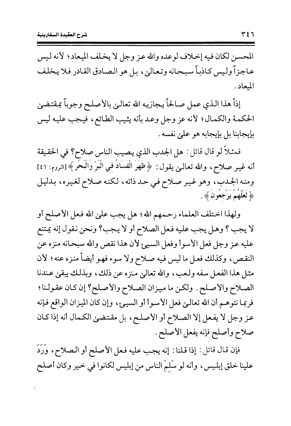 ولهذا اختلف العلماء رحمهم الله؛ هل يجب على الله فعل الأصلح أو لا يجب؟ وهل يجب عليه فعل الصلاح أو لا يجب؟ ونحن نقول إنه يمتنع عليه عز وجل فعل الأسوأ وفعل السيئ لأن هذا نقص والله سبحانه منزه عن النقص، وكذلك فعل ما ليس فيه صلاح ولا سوء فهو أيضاً منزه عنه؛ لأن مثل هذا الفعل سفه ولعب، والله تعالى منزه عن ذلك، وبذلك يبقى عندنا الصلاح والأصلح. ولكن ما ميزان الصلاح والأصلح؟ إن كان عقولنا؛ فربما نتوهم أن الله تعالى فعل الأسوأ أو السيئ، وإن كان الميزان الواقع فإنه عز وجل لا يفعل إلا الصلاح أو الأصلح، بل مقتضى الكمال أنه إذا كان صلاح وأصلح فإنه يفعل الأصلح.