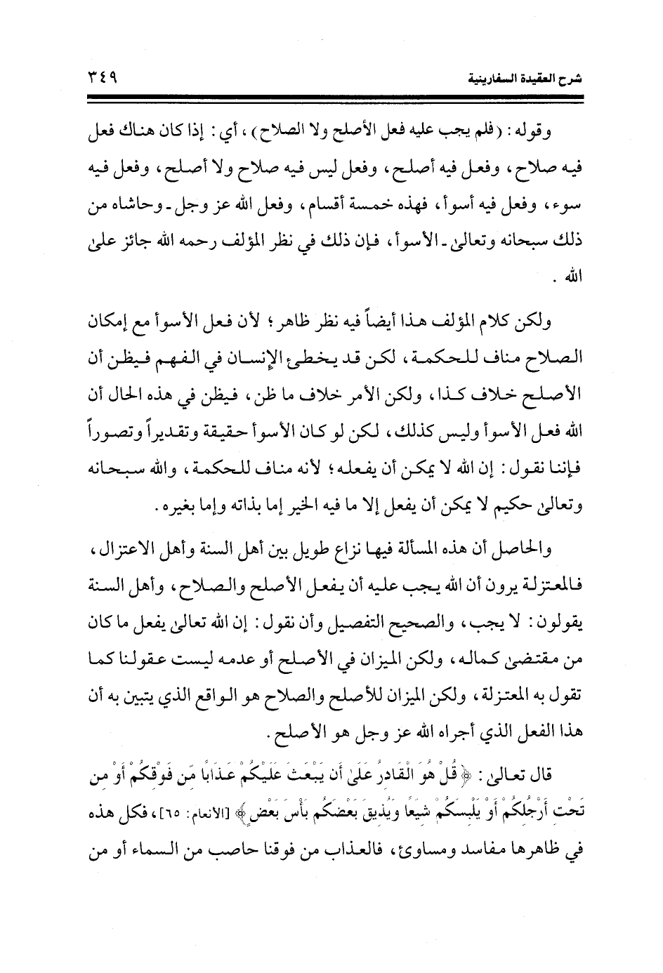 ولكن كلام المؤلف هذا أيضاً فيه نظر ظاهر؛ لأن فعل الأسوأ مع إمكان الصلاح منافٍ للحكمة، لكن قد يخطئ الإنسان في الفهم فيظن أن الأصلح خلاف كذا، ولكن الأمر خلاف ما ظن، فيظن في هذه الحال أن الله فعل الأسوأ وليس كذلك، لكن لو كان الأسوأ حقيقة وتقديرا وتصورا فإننا نقول: إن الله لا يمكن أن يفعله؛ لأنه مناف للحكمة، والله سبحانه وتعالى حكيم لا يمكن أن يفعل إلا ما فيه الخير إما بذاته وإما بغيره.