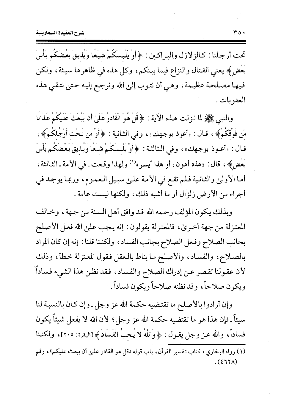 والنبي صلى الله عليه وسلم لما نزلت هذه الآية: (قُلْ هُوَ الْقَادِرُ عَلَى أَنْ يَبْعَثَ عَلَيْكُمْ عَذَاباً مِنْ فَوْقِكُمْ) ، قال: ((أعوذ بوجهك)) ، وفي الثانية: (أَوْ مِنْ تَحْتِ أَرْجُلِكُمْ ٍ) ، قال: ((أعوذ بوجهك)) ، وفي الثالثة: (أَوْ يَلْبِسَكُمْ شِيَعاً وَيُذِيقَ بَعْضَكُمْ بَأْسَ بَعْض) ، قال: ((هذه أهون، أو هذا أيسر) (¬1) ولهذا وقعت - في الأمة - الثالثة، أما الأولى والثانية فلم تقع في الأمة على سبيل العموم، وربما يوجد في أجزاء من الأرض زلزال أو ما أشبه ذلك، ولكنها ليست عامة.