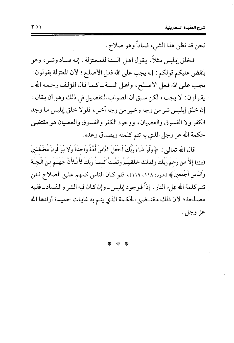 فخلق إبليس مثلاً، يقول أهل السنة للمعتزلة: إنه فساد وشر، وهو ينقض عليكم قولكم: إنه يجب على الله فعل الأصلح؛ لأن المعتزلة يقولون: يجب على الله فعل الأصلح، وأهل السنة - كما قال المؤلف رحمه الله - يقولون: لا يجب، لكن سبق أن الصواب التفصيل في ذلك وهو أن يقال: إن خلق إبليس شر من وجه وخير من وجه آخر، فلولا خلق إبليس ما وجد الكفر ولا الفسوق والعصيان، ووجود الكفر والفسوق والعصيان هو مقتضى حكمة الله عز وجل الذي به تتم كلمته ويصدق وعده.