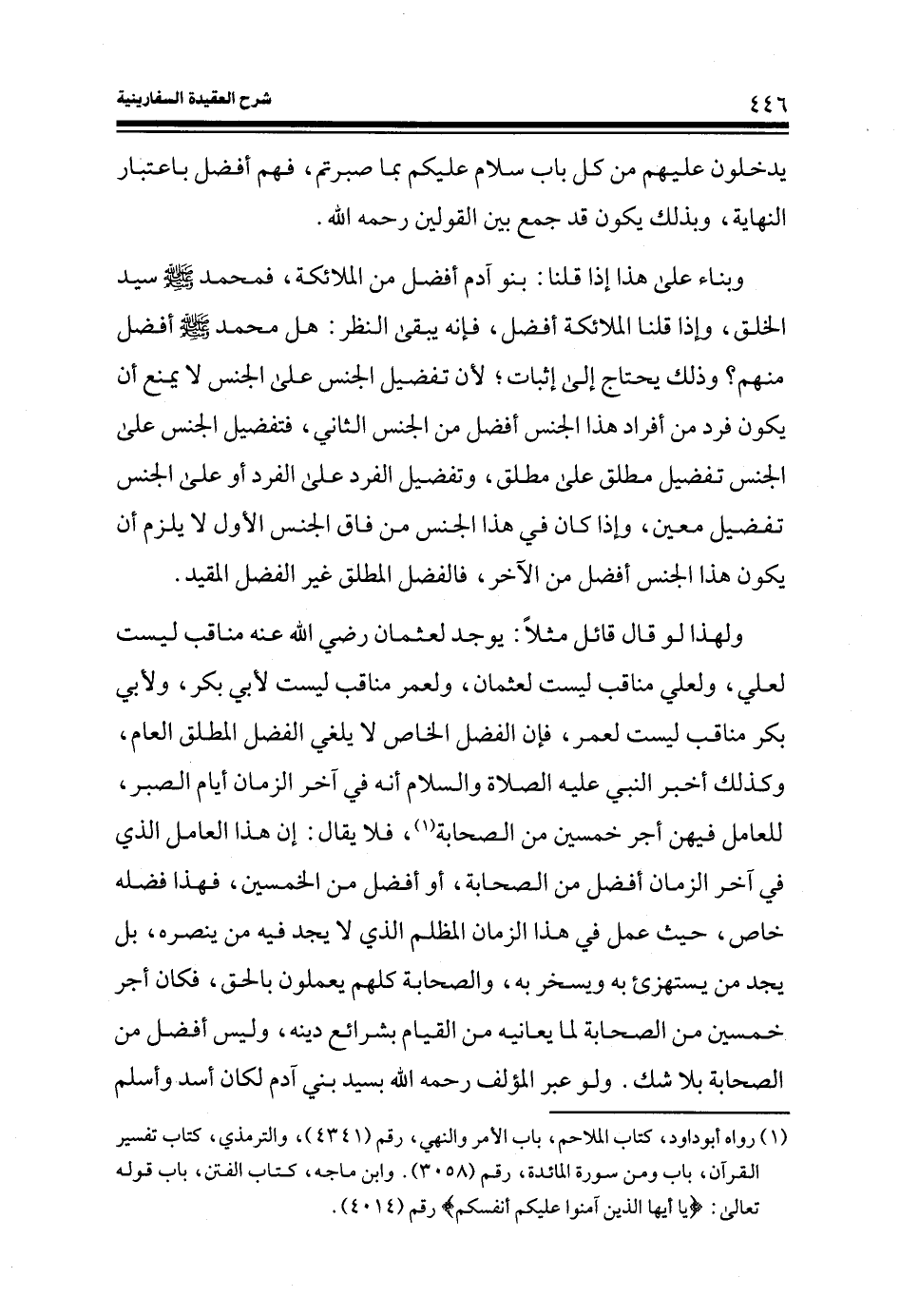 ولهذا لو قال قائل مثلاً: يوجد لعثمان رضي الله عنه مناقب ليست لعلي، ولعلي مناقب ليست لعثمان، ولعمر مناقب ليست لأبي بكر، ولأبي بكر مناقب ليست لعمر، فإن الفضل الخاص لا يلغي الفضل المطلق العام، وكذلك أخبر النبي عليه الصلاة والسلام انه في آخر الزمان أيام الصبر، للعامل فيهن أجر خمسين من الصحابة (¬1) ، فلا يقال: إن هذا العامل الذي في آخر الزمان أفضل من الصحابة، أو أفضل من الخمسين، فهذا فضله خاص، حيث عمل في هذا الزمان المظلم الذي لا يجد فيه من ينصره، بل يجد من يستهزئ به ويسخر به، والصحابة كلهم يعملون بالحق، فكان أجر خمسين من الصحابة لما يعانيه من القيام بشرائع دينه، وليس أفضل من الصحابة بلا شك. ولو عبر المؤلف رحمه الله بسيد بني آدم لكان أسد وأسلم