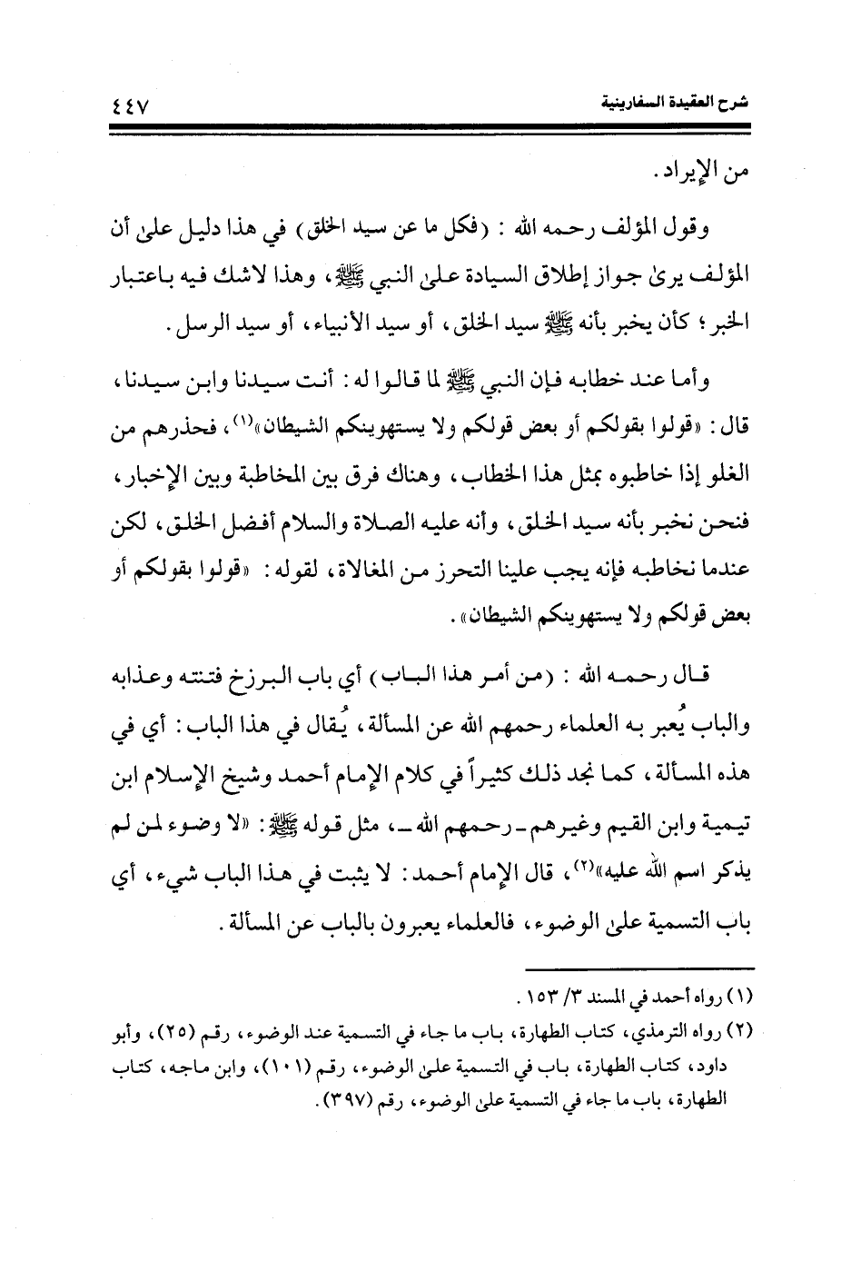 وأما عند خطابه فإن النبي صلى الله عليه وسلم لما قالوا له: أنت سيدنا وابن سيدنا، قال: (قولوا بقولكم أو بعض قولكم ولا يستهوينكم الشيطان) (¬1) ، فحذرهم من الغلو إذا خاطبوه بمثل هذا الخطاب، وهناك فرق بين المخاطبة وبين الإخبار، فنحن نخبر بأنه سيد الخلق، وأنه عليه الصلاة والسلام أفضل الخلق، لكن عندما نخاطبه فإنه يجب علينا التحرز من المغالاة، لقوله: ((قولوا بقولكم أو بعض قولكم ولا يستهوينكم الشيطان)) .