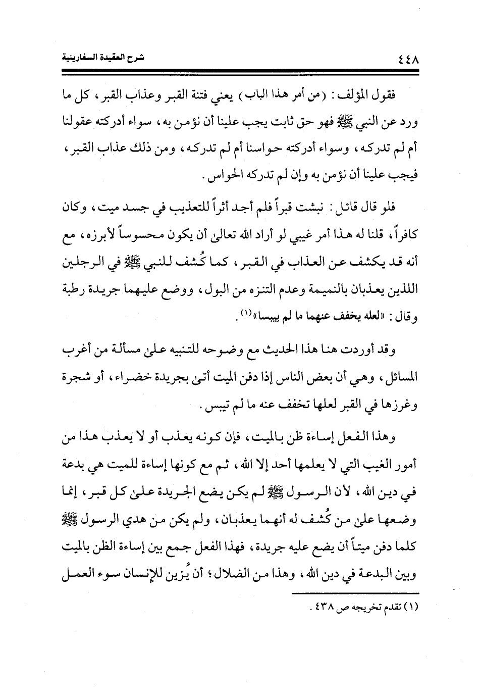 وقد أوردت هنا هذا الحديث مع وضوحه للتنبيه على المسألة من أغرب المسائل، وهي أن بعض الناس إذا دفن الميت أتى بجريدة خضراء، أو شجرة وغرزها في القبر لعلها تخفف عنه ما لم تيبس.