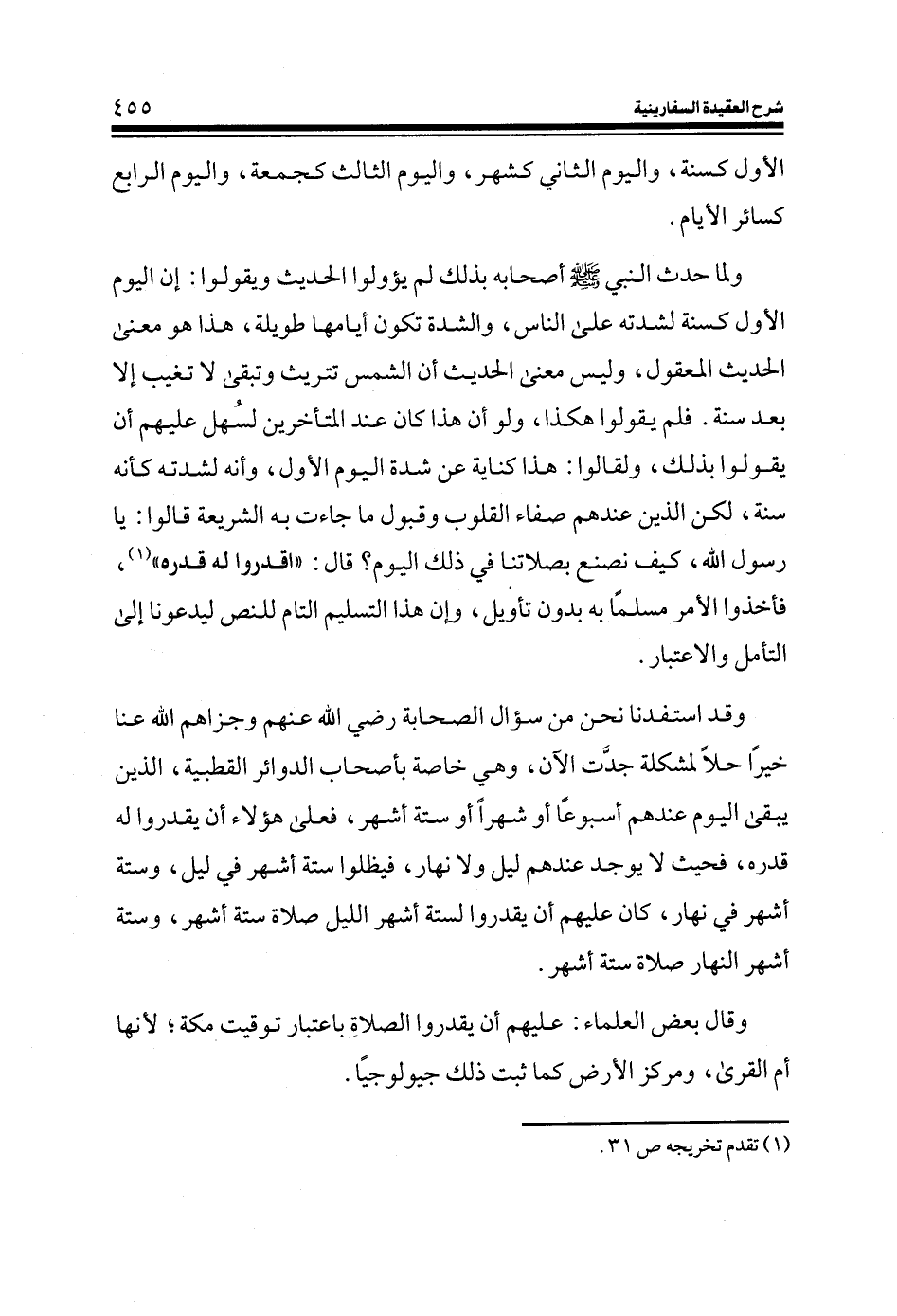 ولما حدث النبي صلى الله عليه وسلم أصحابه بذلك لم يؤولوا الحديث ويقووا: إن اليوم الأول كسنة لشدته على الناس، والشدة تكون أيامها طويلة، هذا هو معنى الحديث المعقول، وليس معنى الحديث أن الشمس تتريث وتبقى لا تغيب إلا بعد سنة. فلم يقولوا هكذا، ولو أن هذا كان عند المتأخرين لسهل عليهم أن يقولوا بذلك، ولقالوا: هذا كناية عن شدة اليوم الأول، وأنه لشدته كأنه سنة، لكن الذين عندهم صفاء القلوب وقبول ما جاءت به الشريعة قالوا: يا رسول الله، كيف نصنع بصلاتنا في ذلك اليوم؟ قال: ((اقدروا له قدره)) (¬1) ، فأخذوا الأمر مسلماً به بدون تأويل، وإن هذا التسليم التام للنص ليدعونا إلى التأمل والاعتبار.