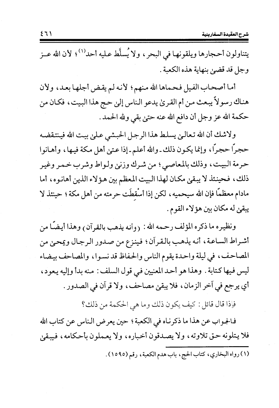 فالجواب عن هذا ما ذكرناه في الكعبة؛ حين يعرض الناس عن كتاب الله فلا يتلونه حق تلاوته، ولا يصدقون أخباره، ولا يعلمون بأحكامه، فيبقى
