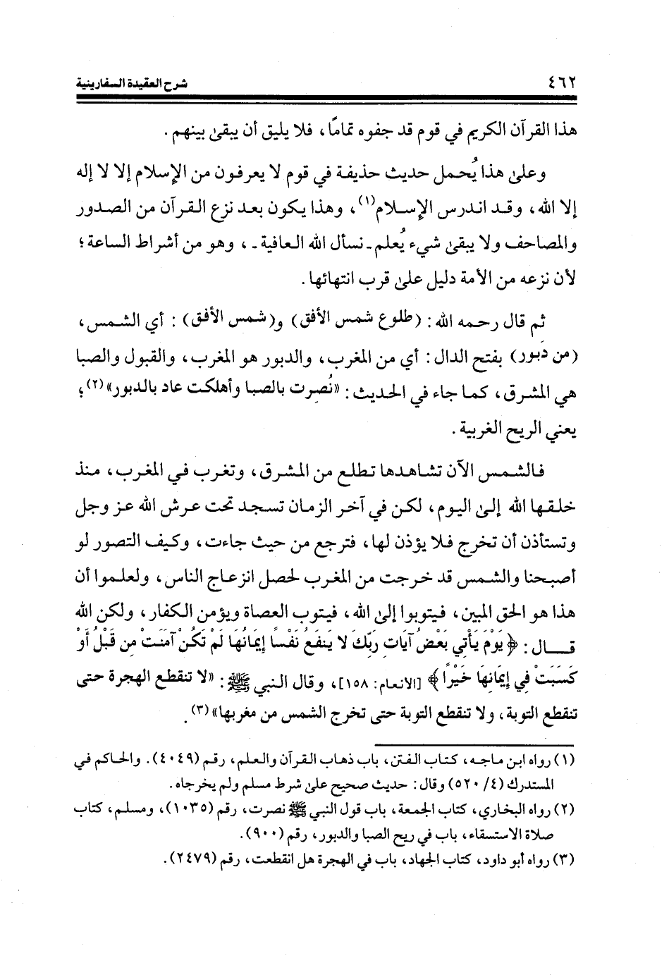 فالشمس الآن تشاهدها تطلع من المشرق، وتغرب في المغرب، منذ خلقها الله إلى اليوم، لكن في آخر الزمان تسجد تحت عرش الله عز وجل وتستأذن أن تخرج فلا يؤذن لها، فترجع من حيث جاءت، وكيف التصور لو أصبحنا والشمس قد خرجت من المغرب لحصل انزعاج الناس، ولعلموا أن هذا هو الحق المبين، فيتوبوا إلى الله، فيتوب العصاة ويؤمن الكفار، ولكن الله قال: (يَوْمَ يَأْتِي بَعْضُ آيَاتِ رَبِّكَ لا يَنْفَعُ نَفْساً إِيمَانُهَا لَمْ تَكُنْ آمَنَتْ مِنْ قَبْلُ أَوْ كَسَبَتْ فِي إِيمَانِهَا خَيْراً) (الأنعام: الآية158) ، وقال النبي صلى الله عليه وسلم: ((لا تنقطع الهجرة حتى تنقطع التوبة، ولا تنقطع التوبة حتى تخرج الشمس من مغربها)) (¬3) .