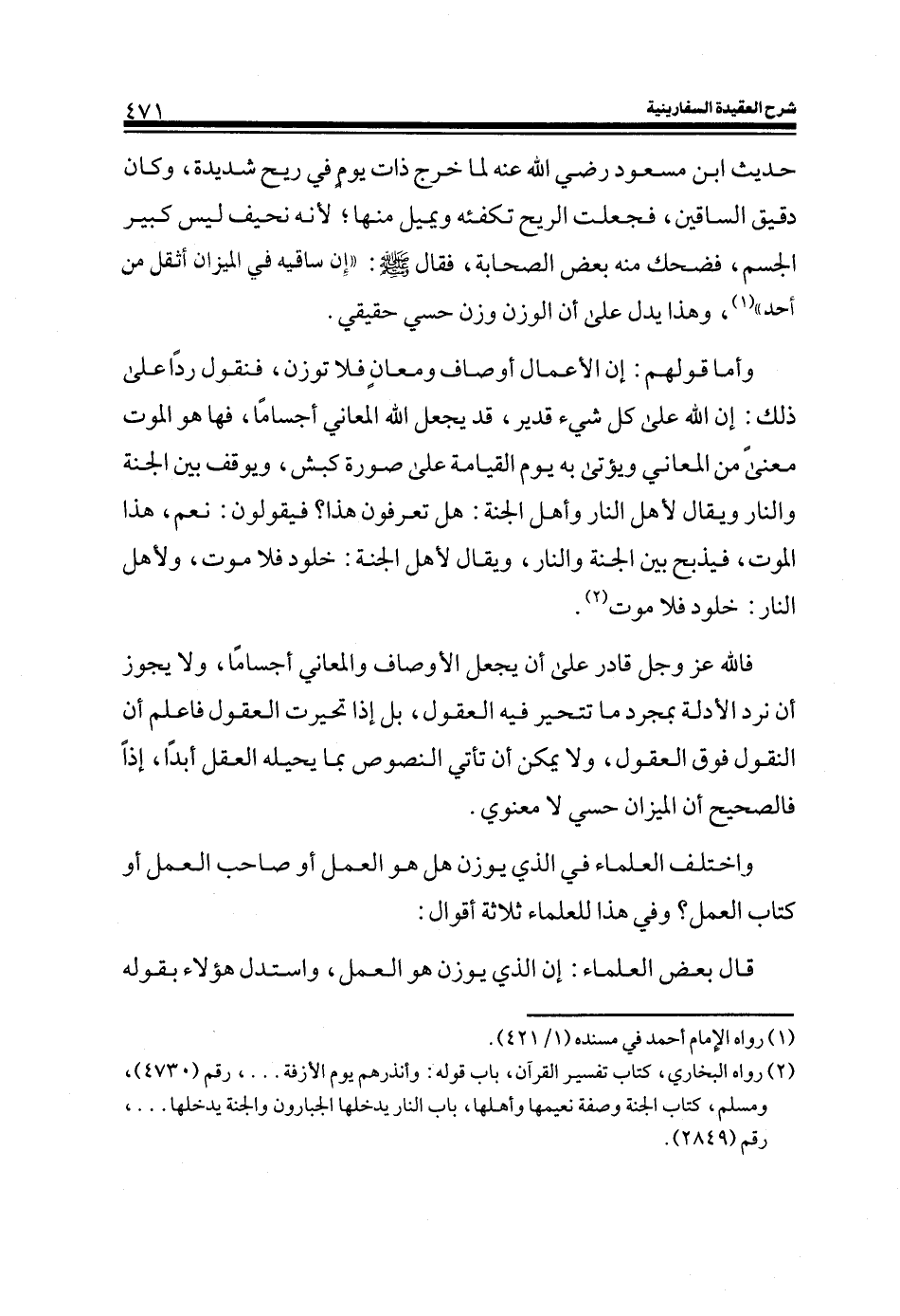 حديث ابن مسعود رضي الله عنه لما خرج ذات يوم في ريح شديدة، وكان دقيق الساقين، فجعلت الريح تكفئه ويميل منها؛ لأنه نحيف ليس كبير الجسم، فضحك منه بعض الصحابة، فقال صلى الله عليه وسلم: ((إن ساقيه في الميزان أثقل من أُحد)) (¬1) ، وهذا يدل على أن الوزن وزن حسي حقيقي.