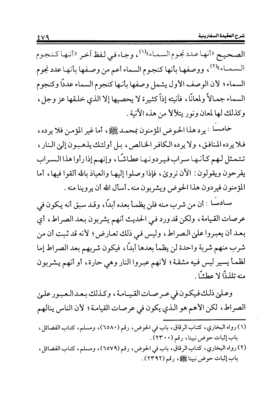خامساً: يرد هذا الحوض المؤمن بمحمد صلى الله عليه وسلم، أما غير المؤمن فلا يرده، فلا يرده المنافق، ولا يرده الكافر الخالص، بل أولئك يذهبون إلى النار، تتمثل لهم كأنها سراب فيردونها عطاشا، وإنهم إذا رأوا هذا السراب يفرحون ويقولون: الآن نروى، فإذا وصلوا إليها والعياذ بالله ألقوا فيها، أما المؤمنون فيردون هذا الحوض ويشربون منه - أسأل الله أن يروينا منه.