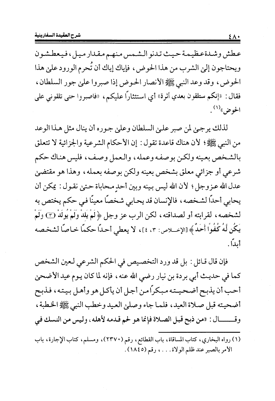 لذلك يرجى لمن صبر على السلطان وعلى جوره أن ينال مثل هذا الوعد من النبي صلى الله عليه وسلم؛ لأن هناك قاعدة تقول: أن الأحكام الشرعية والجزائية لا تتعلق بالشخص بعينه ولكن بوصفه وعمله، والعمل وصف، فليس هناك حكم شرعي أو جزائي معلق بشخص بعينه ولكن بوصفه بعمله، وهذا هو مقتضى عدل الله عز وجل؛ لأن الله ليس بينه وبين أحد محاباة حتى نقول: يمكن أن يحابي أحداً لشخصه، فالإنسان قد يحابي شخصاً معيناً في حكم يختص به لشخصه، لقرابته أو لصداقته، لكن الرب عز وجل (لَمْ يَلِدْ وَلَمْ يُولَدْ) (الإخلاص: 3) (وَلَمْ يَكُنْ لَهُ كُفُواً أَحَدٌ) (الإخلاص: 4) ، لا يعطي أحداً حكماً خاصاً لشخصه أبدا.