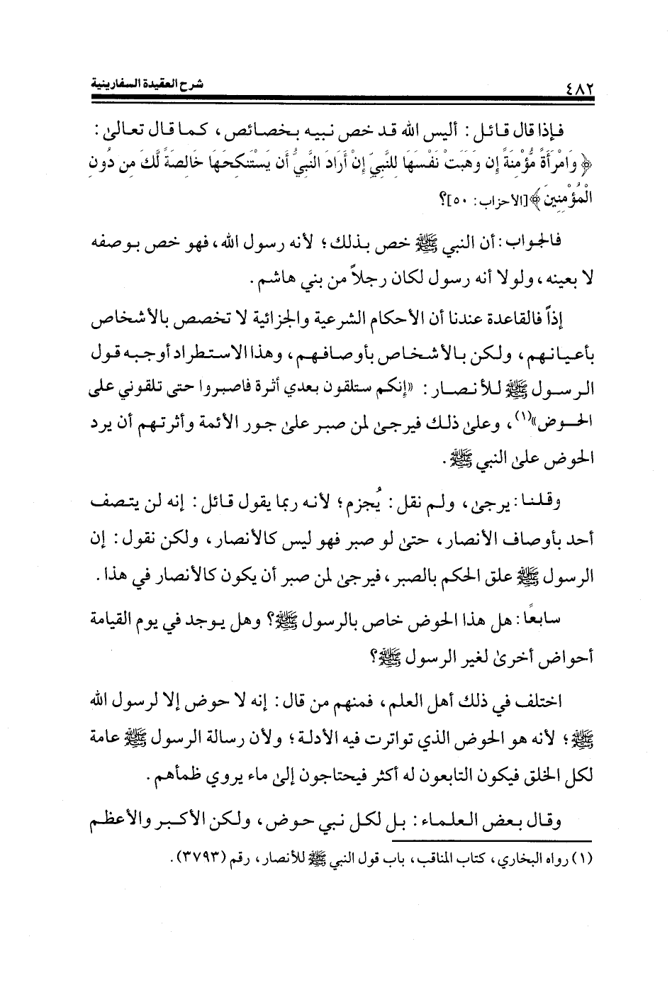 إذاً فالقاعدة عندنا أن الأحكام الشرعية والجزائية لا تخصص بالأشخاص بأعيانهم، ولكن بالأشخاص بأوصافهم، وهذا الاستطراد أوجبه قول الرسول صلى الله عليه وسلم للأنصار: ((إنكم ستلقون بعدي أثرة فاصبروا حتى تلقوني على الحوض)) (¬1) ، وعلى ذلك فيرجى لمن صبر على جور الأئمة وأثرتهم أن يرد الحوض على النبي صلى الله عليه وسلم.