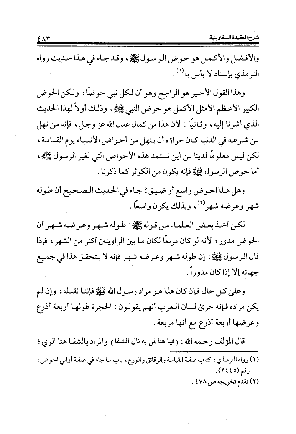 وهذا القول الأخير هو الراجح وهو أن لكل نبي حوضاً، ولكن الحوض الكبير الأعظم الأمثل الأكمل هو حوض النبي صلى الله عليه وسلم، وذلك: