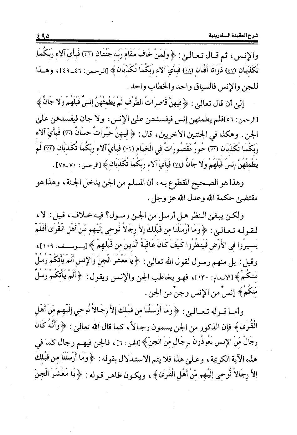 والإنس، ثم قال تعالى: ((وَلِمَنْ خَافَ مَقَامَ رَبِّهِ جَنَّتَانِ) (الرحمن: 46) (فَبِأَيِّ آلاءِ رَبِّكُمَا تُكَذِّبَانِ) (الرحمن: 47) (ذَوَاتَا أَفْنَانٍ) (الرحمن: 48) (فَبِأَيِّ آلاءِ رَبِّكُمَا تُكَذِّبَانِ) (الرحمن: 49)) ، وهذا للجن والإنس فالسياق واحد والخطاب واحد. إلى أن قال تعالى: (فِيهِنَّ قَاصِرَاتُ الطَّرْفِ لَمْ يَطْمِثْهُنَّ إِنْسٌ قَبْلَهُمْ وَلا جَانٌّ) (الرحمن: 56) فلم يطمثهن إنس فيفسدهن على الإنس، ولا جان فيفسدهن على الجن.