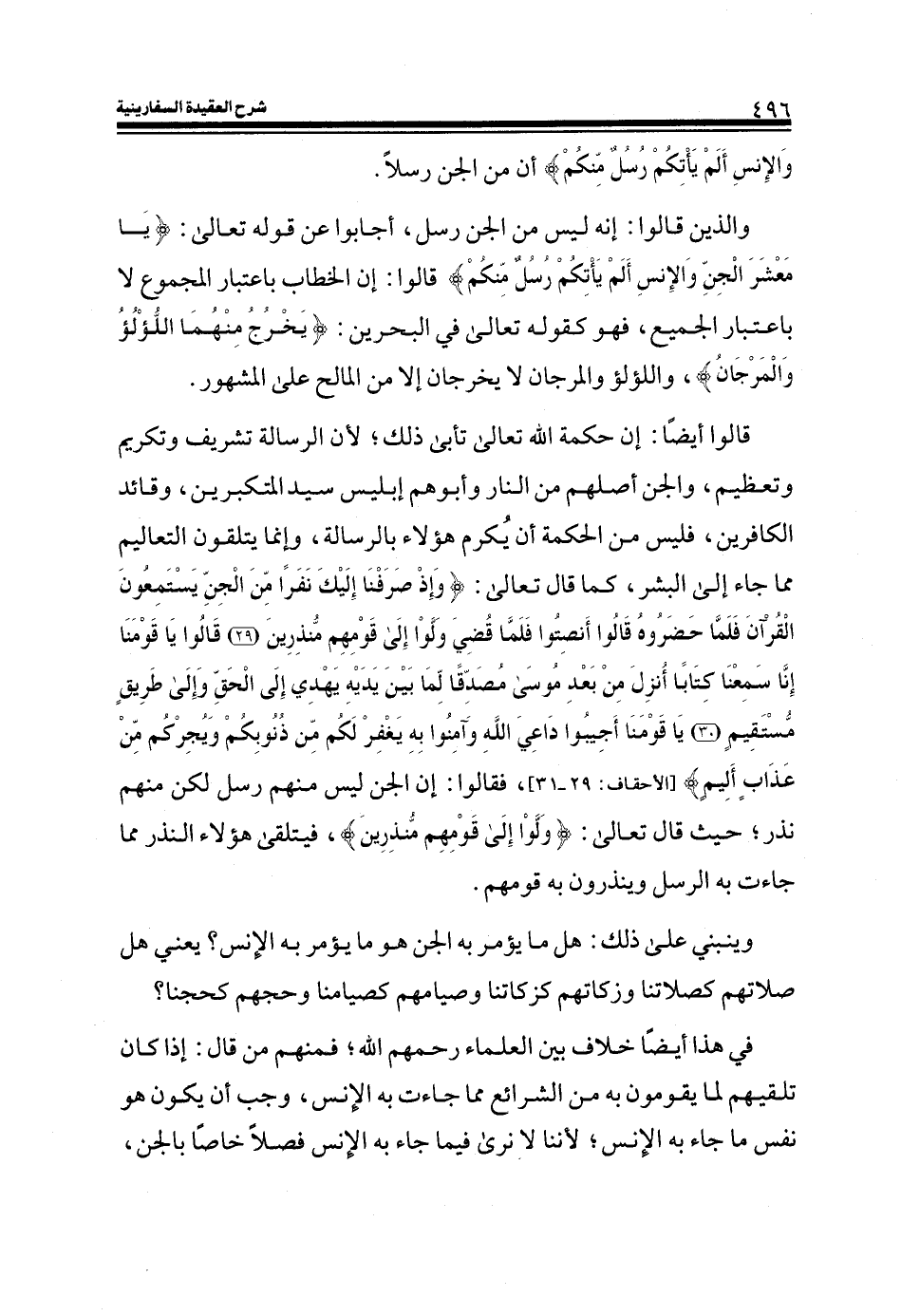 قالوا أيضاً: إن حكمة الله تعالى تأبى ذلك؛ لأن الرسالة تشريف وتكريم وتعظيم، والجن أصلهم من النار وأبوهم إبليس سيد المتكبرين، وقائد الكافرين، فليس من الحكمة أن يكرم هؤلاء بالرسالة، وإنما يتلقون التعاليم مما جاء إلى البشر، كما قال تعالى: (وَإِذْ صَرَفْنَا إِلَيْكَ نَفَراً مِنَ الْجِنِّ يَسْتَمِعُونَ القرآن فَلَمَّا حَضَرُوهُ قَالُوا أَنْصِتُوا فَلَمَّا قُضِيَ وَلَّوْا إِلَى قَوْمِهِمْ مُنْذِرِينَ) (الاحقاف: 29) (قَالُوا يَا قَوْمَنَا إِنَّا سَمِعْنَا كِتَاباً أُنْزِلَ مِنْ بَعْدِ مُوسَى مُصَدِّقاً لِمَا بَيْنَ يَدَيْهِ يَهْدِي إِلَى الْحَقِّ وَإِلَى طَرِيقٍ مُسْتَقِيمٍ) (الاحقاف: 30) (يَا قَوْمَنَا أَجِيبُوا دَاعِيَ اللَّهِ وَآمِنُوا بِهِ يَغْفِرْ لَكُمْ مِنْ ذُنُوبِكُمْ وَيُجِرْكُمْ مِنْ عَذَابٍ أَلِيمٍ) (الاحقاف: 31) فقالوا: إن الجن ليس منهم رسل لكن منهم نذر؛ حيث قال تعالى: (وَلَّوْا إِلَى قَوْمِهِمْ مُنْذِرِينَ) ، فيتلقى هؤلاء النذر مما جاءت به الرسل وينذرون بها قومهم. وينبني على ذلك: هل ما يؤمر به الجن هو ما يؤمر به الإنس؟ يعني هل صلاتهم كصلاتنا وزكاتهم كزكاتنا وصيامهم كصيامنا وحجهم كحجنا؟