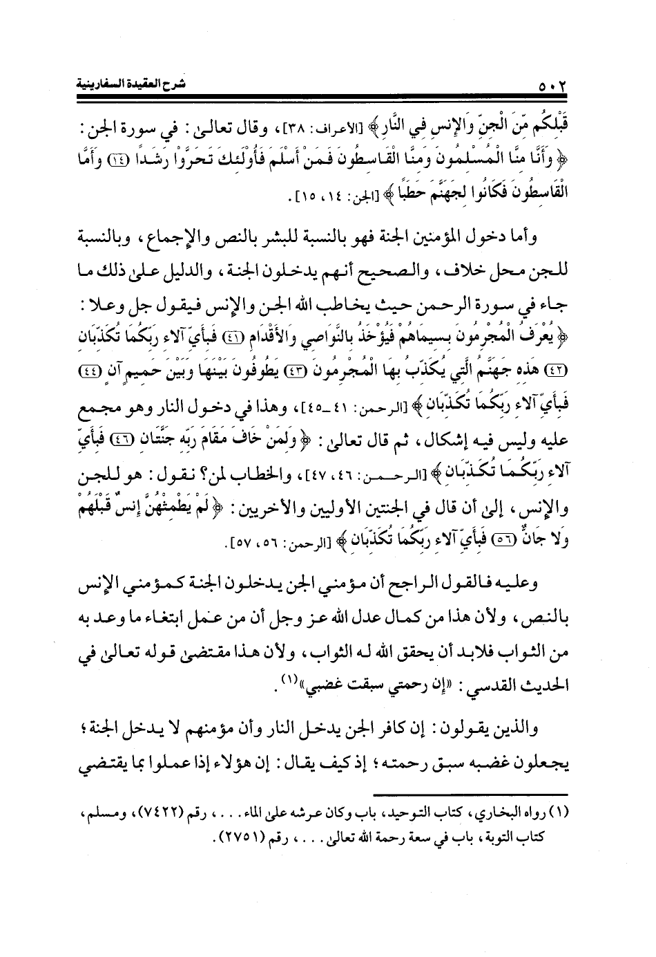 قَبْلِكُمْ مِنَ الْجِنِّ وَالْأِنْسِ فِي النَّارِ) (الأعراف: الآية 38) ، وقال تعالى: في سورة الجن: (وَأَنَّا مِنَّا الْمُسْلِمُونَ وَمِنَّا الْقَاسِطُونَ فَمَنْ أَسْلَمَ فَأُولَئِكَ تَحَرَّوْا رَشَداً) (الجن: 14) (وَأَمَّا الْقَاسِطُونَ فَكَانُوا لِجَهَنَّمَ حَطَباً) (الجن: 15) وأما دخول المؤمنين الجنة فهو بالنسبة للبشر بالنص والإجماع، وبالنسبة للجن محل خلاف، والصحيح أنهم يدخلون الجنة، والدليل على ذلك ما جاء في سورة الرحمن حيث يخاطب الله الجن والإنس فيقول جل وعلا (يُعْرَفُ الْمُجْرِمُونَ بِسِيمَاهُمْ فَيُؤْخَذُ بِالنَّوَاصِي وَالْأَقْدَامِ) (الرحمن: 41) (فَبِأَيِّ آلاءِ رَبِّكُمَا تُكَذِّبَانِ) (الرحمن: 42) (هَذِهِ جَهَنَّمُ الَّتِي يُكَذِّبُ بِهَا الْمُجْرِمُونَ) (الرحمن: 43) (يَطُوفُونَ بَيْنَها وَبَيْنَ حمَِيمٍ آنٍ) (الرحمن: 44) (فَبِأَيِّ آلاءِ رَبِّكُمَا تُكَذِّبَانِ) (الرحمن: 45) ، وهذا في دخول النار وهو مجمع عليه وليس فيه إشكال، ثم قال تعالى: (وَلِمَنْ خَافَ مَقَامَ رَبِّهِ جَنَّتَانِ) (الرحمن: 46) (فَبِأَيِّ آلاءِ رَبِّكُمَا تُكَذِّبَانِ) (الرحمن: 47) ، والخطاب لمن؟ نقول: هو للجن والإنس، إلى أن قال في الجنتين الأوليين والأخريين (لَمْ يَطْمِثْهُنَّ إِنْسٌ قَبْلَهُمْ وَلا جَانٌّ) (الرحمن: 74) (فَبِأَيِّ آلاءِ رَبِّكُمَا تُكَذِّبَانِ) (الرحمن: 75)) ،