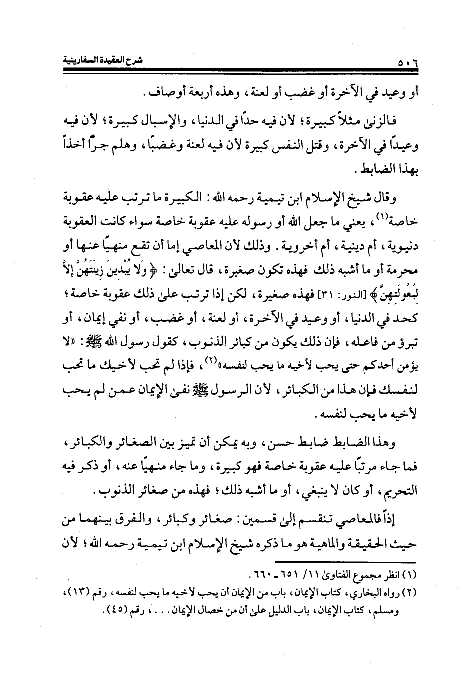 وقال شيخ الإسلام ابن تيمية رحمه الله: الكبيرة ما ترتب عليه عقوبة خاصة (¬1) ، يعني ما جعل الله أو رسوله عليه عقوبة خاصة سواء كانت العقوبة دنيوية، أم دينية، أم أخروية. وذلك لأن المعاصي إما أن تقع منهياً عنها أو محرمة أو ما أشبه ذلك فهذه تكون صغيرة قال تعالى: (وَلا يُبْدِينَ زِينَتَهُنَّ إِلَّا لِبُعُولَتِهِنّ) (النور: الآية 31) فهذه صغيرة، لكن إذا ترتب على ذلك عقوبة خاصة؛ كحدٍ في الدنيا، أو وعيد في الآخرة، أو لعنة، أو غضب، أو نفي إيمان، أو تبرؤ من فاعله، فإن ذلك يكون من كبائر الذنوب، كقول رسول الله صلى الله عليه وسلم: ((لا يؤمن أحدكم حتى يحب لأخيه ما يحب لنفسه)) (¬2) ، فإذا لم تحب لأخيك ما تحب لنفسك فإن هذا من الكبائر، لأن الرسول صلى الله عليه وسلم نفى الإيمان عمن لم يحب لأخيه ما يحب لنفسه.
