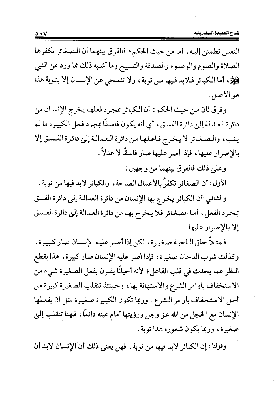 والثاني أن الكبائر يخرج بها الإنسان من دائرة العدالة إلى دائرة الفسق بمجرد الفعل، أما الصغائر فلا يخرج بها من دائرة العدالة إلى دائرة الفسق إلا بالإصرار عليها.
