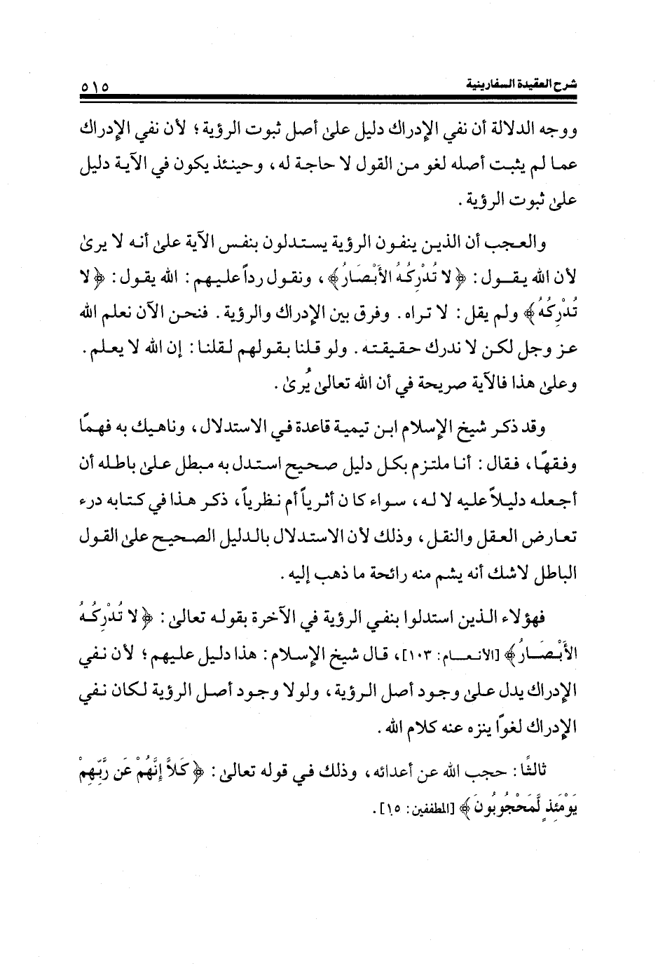فهؤلاء الذين استدلوا بنفي الرؤية في الآخرة بقوله تعالى: (لا تُدْرِكُهُ الْأَبْصَارُ) ، قال شيخ الإسلام: هذا دليل عليهم؛ لأن نفي الإدراك يدل على وجود أصل الرؤية، ولولا وجود أصل الرؤية لكان نفي الإدراك لغوا ينزه عنه كلام الله.