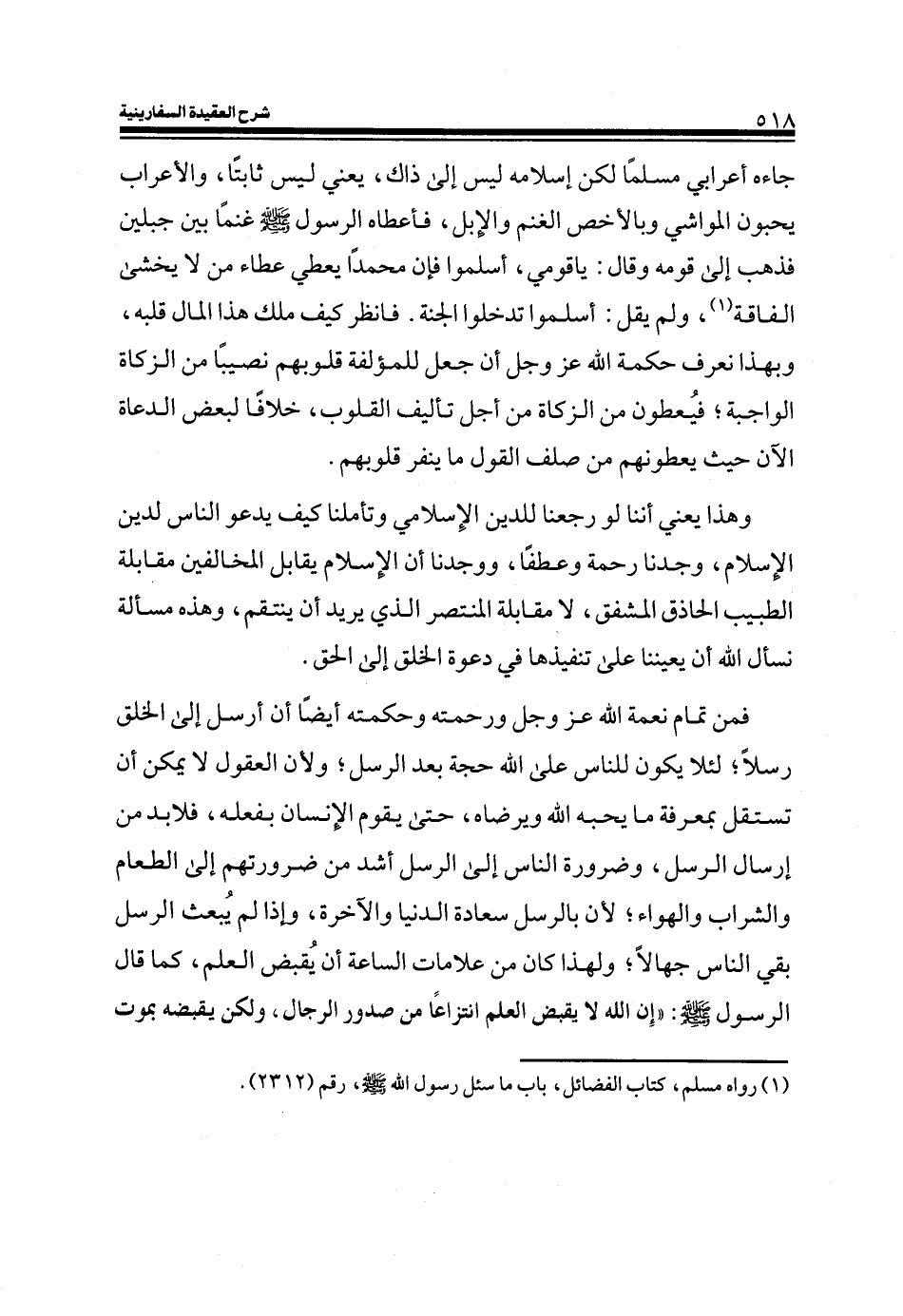 جاء أعرابي مسلما لكن إسلامه ليس إلى ذاك، يعني ليس ثابتاً، والأعراب يحبون المواشي وبالأخص الغنم والإبل، فأعطاه الرسول صلى الله عليه وسلم غنماً بين جبلين فذهب إلى قومه وقال: يا قومي، أسلموا فإن محمداً يعطي عطاء من لا يخشى الفاقة (¬1) ، ولم يقل: اسلموا تدخلوا الجنة. فانظر كيف ملك هذا المال قلبه، وبهذا نعرف حكمة الله عز وجل أن جعل للمؤلفة قلوبهم نصيباً من الزكاة الواجبة؛ فيعطون من الزكاة من أجل تأليف القلوب، خلافاً لبعض الدعاة الآن حيث يعطونهم من صلف القول ما ينفر قلوبهم.