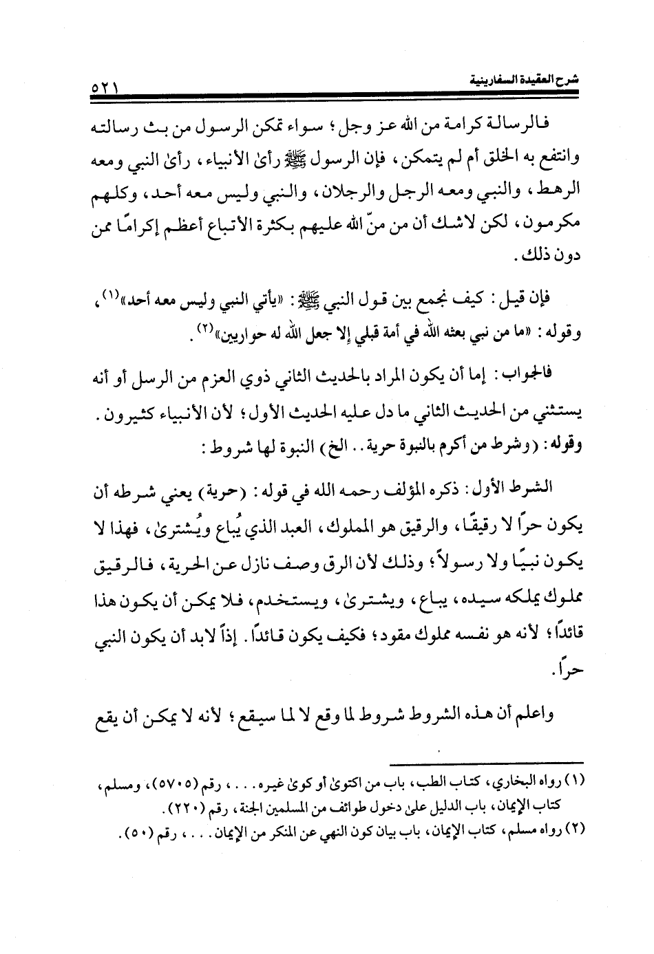 فالجواب: إما أن يكون المراد بالحديث الثاني ذوي العزم من الرسل أو أنه يستثني من الحديث الثاني ما دل عليه الحديث الأول؛ لأن الأنبياء كثيرون. وقوله: (وشرط من أكرم بالنبوة حرية ... الخ) النبوة لها شروط:
