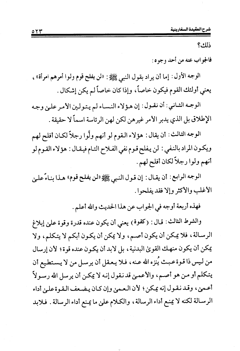 والشرط الثالث: قال: (كقوة) يعني أن يكون عنده قدرة وقوة على إبلاغ الرسالة، فلا يمكن أن يكون أصم، ولا يمكن أن يكون أبكم لا يتكلم، ولا يمكن أن يكون منهك القوى البدنية، بل لابد أن يكون عنده قوة؛ لأن إرسال من ليس ذا قوة عبث ينزه الله عنه، فلا يعقل أن يرسل من لا يستطيع أن يتكلم أو من هو أصم، والأعمى قد نقول إنه لا يمكن أن يرسل الله رسولاً أعمى، وقد نقول انه يمكن؛ لأن العمى وإن كان يضعف القوة على أداء الرسالة لكنه لا يمنع أداء الرسالة، والكلام على ما يمنع أداء الرسالة. فلابد
