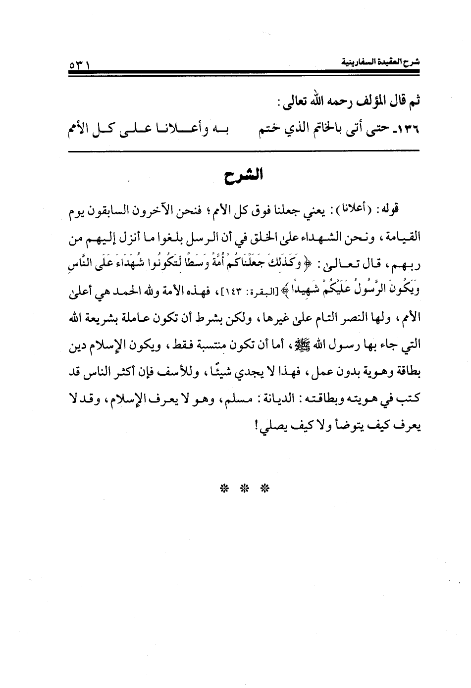 قوله: (إعلانا) : يعني جعلنا فوق كل الأمم؛ فنحن الآخرون السابقون يوم القيامة، ونحن الشهداء على الخلق في أن الرسل بلغوا ما أُنزل إليهم من ربهم، قال تعالى: (وَكَذَلِكَ جَعَلْنَاكُمْ أُمَّةً وَسَطاً لِتَكُونُوا شُهَدَاءَ عَلَى النَّاسِ وَيَكُونَ الرَّسُولُ عَلَيْكُمْ شَهِيداً) (البقرة: الآية143) ، فهذه الأمة ولله الحمد هي أعلى الأمم، ولها النصر التام على غيرها، ولكن بشرط أن تكون عاملة بشريعة الله التي جاء بها رسول الله صلى الله عليه وسلم، أما أن تكون منتسبة فقط، ويكون الإسلام دين بطاقة وهوية بدون عمل، فهذا لا يجدي شيئاً، وللأسف فإن أكثر الناس قد كتب في هويته وبطاقته: الديانة: مسلم، وهو لا يعرف الإسلام، وقد لا يعرف كيف يتوضأ ولا كيف يصلي