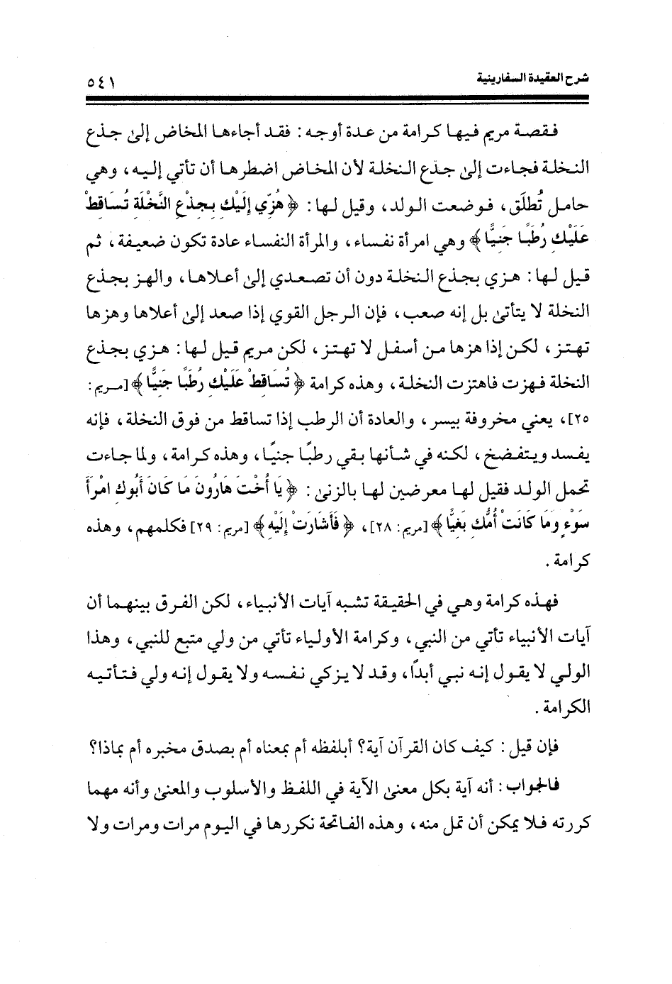 فقصة مريم فيها كرامة من عدة أوجه فقد فجاءها المخاض إلى جذع النخلة فجاءت إلى جذع النخلة لأن المخاض اضطرها أن تأتي إليه، وهي حامل تطلق، فوضعت الولد، وقيل لها: (وَهُزِّي إِلَيْكِ بِجِذْعِ النَّخْلَةِ تُسَاقِطْ عَلَيْكِ رُطَباً جَنِيّاً) (مريم: 25) وهي امرأة نفساء، والمرأة النفساء عادة تكون ضعيفة، ثم قيل لها: هزي بجذع النخلة دون أن تصعدي إلى أعلاها، والهز بجذع النخلة لا يتأتى بل إنه صعب، فإن الرجل القوي إذا صعد إلى أعلاها وهزها تهتز، لكن إذا هزها من أسفل لا تهتز، لكن مريم قيل لها: هزي بجذع النخلة فهزت فاهتزت النخلة، وهذه كرامة (تُسَاقِطْ عَلَيْكِ رُطَباً جَنِيّاً) (مريم: الآية25) ، يعني مخروفة بيسر، والعادة أن الرطب إذا تساقط من فوق النخلة، فإنه يفسد ويتفضخ، لكنه في شأنها بقي رطبا جنيا، وهذه كرامة، ولما جاءت تحمل الولد فقيل لها معرضين لها بالزنى: (يَا أُخْتَ هَارُونَ مَا كَانَ أَبُوكِ امْرَأَ سَوْءٍ وَمَا كَانَتْ أُمُّكِ بَغِيّاً) (مريم: 28) ، (فَأَشَارَتْ إِلَيْهِ) (مريم: الآية29) فكلمهم، وهذه كرامة.