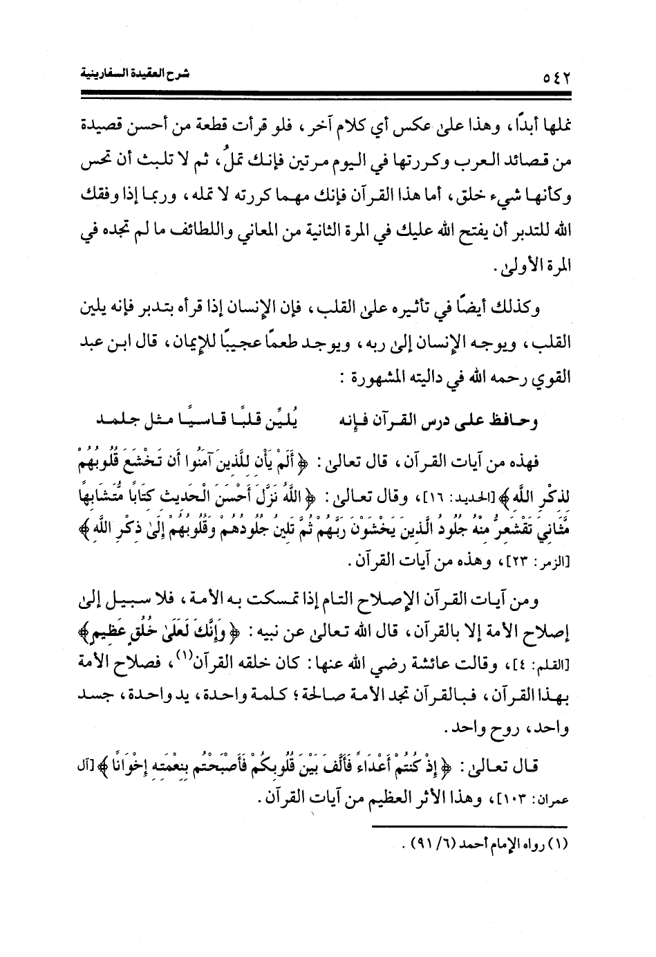 وكذلك أيضاً في تأثيره على القلب، فإن الإنسان إذا قرأه بتدبر فإنه يلين القلب، ويوجه الإنسان إلى ربه، ويوجد طعماً عجيباً للإيمان، قال ابن عبد القوي رحمه الله في داليته المشهورة: