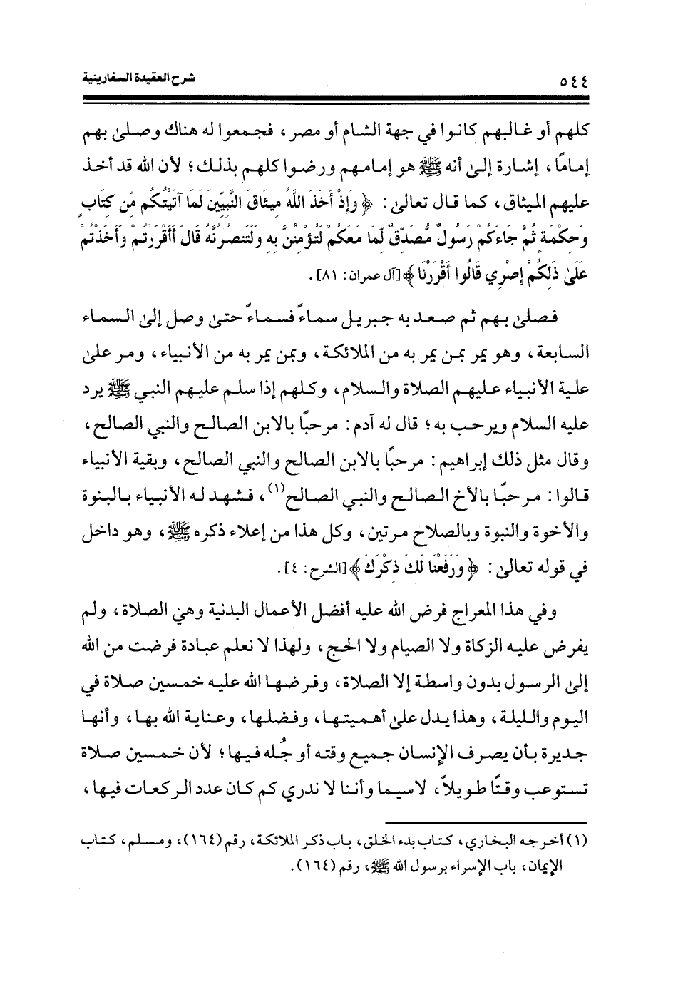 فصلى بهم ثم صعد به جبريل سماء فسماء حتى وصل إلى السماء السابعة، وهو يمر بمن يمر به من الملائكة، وبمن يمر به من الأنبياء، ومر عَلَى عِلْيَة الأنبياء عليهم الصلاة والسلام، وكلهم إذا سلم عليهم النبي صلى الله عليه وسلم يرد عليه السلام ويرحب به؛ قال له آدم: مرحباً بالابن الصالح والنبي الصالح، وقال مثل ذلك إبراهيم: مرحباً بالابن الصالح والنبي الصالح، وبقية الأنبياء قالوا: مرحباً بالأخ الصالح والنبي الصالح (¬1) ، فشهد له الأنبياء بالبنوة والإخوة والنبوة وبالصلاح مرتين، وكل هذا من إعلاء ذكره صلى الله عليه وسلم، وهو داخل في قوله تعالى: (وَرَفَعْنَا لَكَ ذِكْرَكَ) (الشرح: 4) .