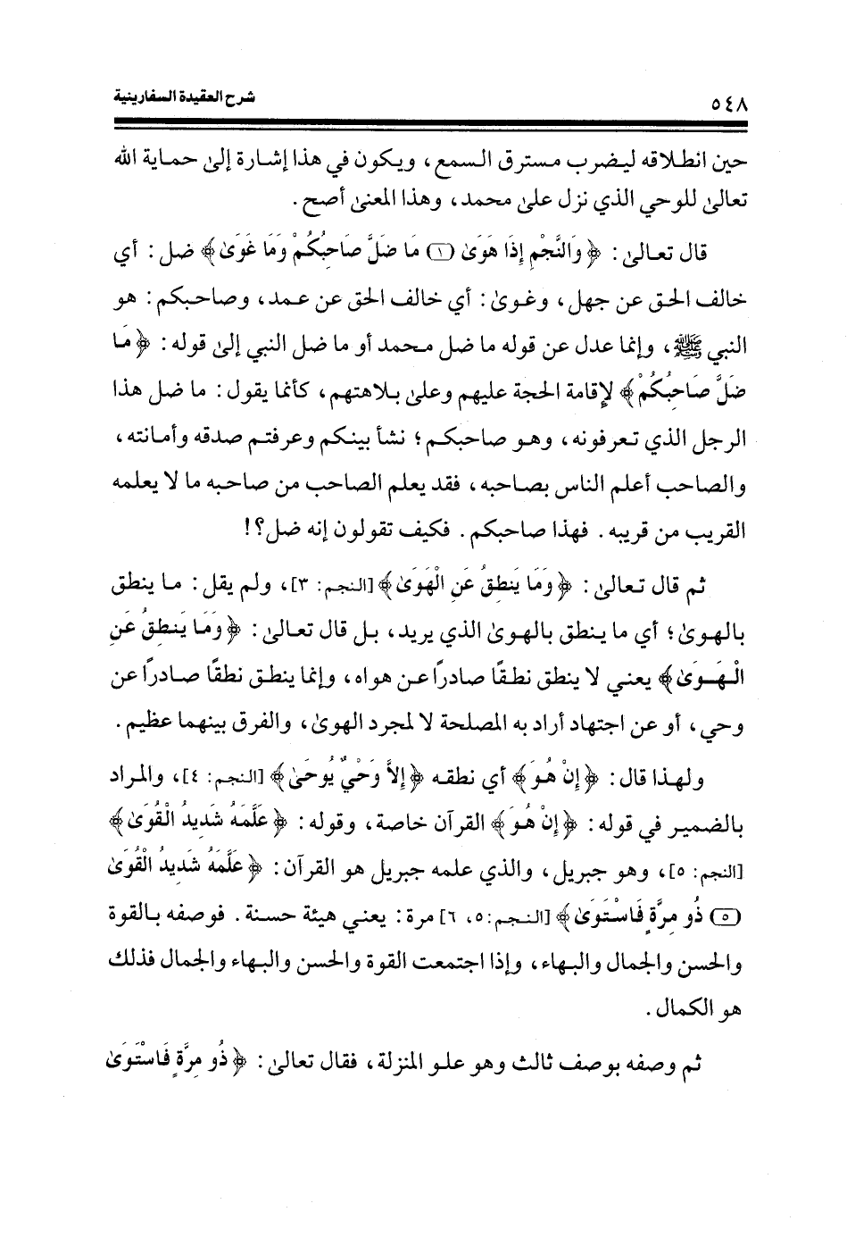 ولهذا قال: (إِنْ هُوَ) (النجم: الآية4)) أي نطقه (إِلَّا وَحْيٌ يُوحَى) (النجم: الآية4) ، والمراد بالضمير في قوله: (إِنْ هُوَ) (النجم: الآية4) القرآن خاصة، وقوله: (عَلَّمَهُ شَدِيدُ الْقُوَى) (النجم: 5) ، وهو جبريل، والذي علمه جبريل هو القرآن: (عَلَّمَهُ شَدِيدُ الْقُوَى) (النجم: 5) (ذُو مِرَّةٍ فَاسْتَوَى) (النجم: 6) مرة: يعني هيئة حسنة. فوصفه بالقوة والحسن والجمال والبهاء، وإذا اجتمعت القوة والحسن والبهاء والجمال فذلك هو الكمال.