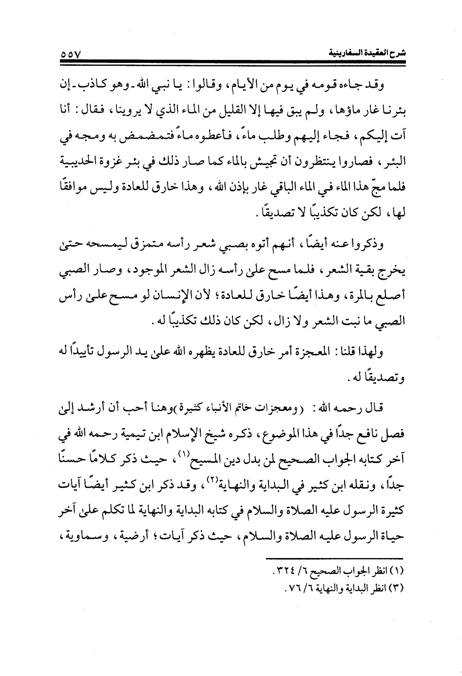 قال رحمه الله: (ومعجزات خاتم الأنباء كثيرة) وهنا أحب أن ارشد إلى فصل نافع جداً في هذا الموضوع، ذكره شيخ الإسلام ابن تيمية رحمه الله في آخر كتابه الجواب الصحيح لمن بدل دين المسيح (¬1) ، حيث ذكر كلاماً حسناً جدا، ونقله ابن كثير في البداية والنهاية (¬2) ، وقد ذكر ابن كثير أيضاً آيات كثيرة للرسول عليه الصلاة والسلام في كتابه البداية والنهاية لما تكلم على آخر حياة الرسول عليه الصلاة والسلام، حيث ذكر آيات؛ أرضية، وسماوية،
