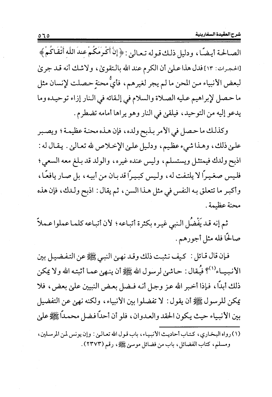 فإن قال قائل: كيف نثبت ذلك وقد نهى النبي صلى الله عليه وسلم عن التفضيل بين الأنبياء (¬1) ؟ فيقال: حاشى لرسول الله صلى الله عليه وسلم أن ينهى عما أثبته الله ولا يمكن ذلك أبداً، فإذا اخبر الله عز وجل انه فضل بعض النبيين على بعض، فلا يمكن للرسول صلى الله عليه وسلم أن يقول: لا تفضلوا بين الأنبياء، ولكنه نهى عن التفضيل بين الأنبياء حيث يكون الحقد والعدوان، فلو أن أحداً فضل محمدا صلى الله عليه وسلم على