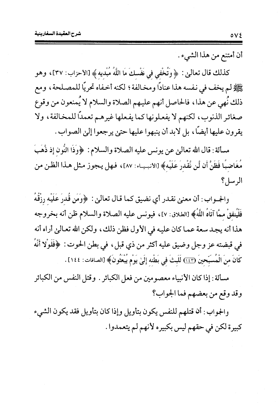 والجواب: أن معنى نقدر أي نضيق كما قال تعالى: (وَمَنْ قُدِرَ عَلَيْهِ رِزْقُهُ فَلْيُنْفِقْ مِمَّا آتَاهُ اللَّهُ) (الطلاق: الآية7) ، فيونس عليه الصلاة والسلام ظن أنه بخروجه هذا أنه يجد سعة عما كان عليه في الأول فظن ذلك، ولكن الله تعالى أراه انه في قبضته عز وجل وضيق عليه أكثر من ذي قبل، في بطن الحوت: (فَلَوْلا أَنَّهُ كَانَ مِنَ الْمُسَبِّحِينَ) (الصافات: 143) (لَلَبِثَ فِي بَطْنِهِ إِلَى يَوْمِ يُبْعَثُونَ) (الصافات: 144) . مسألة: إذا كان الأنبياء معصومين من فعل الكبائر. وقتل النفس من الكبائر وقد وقع من بعضهم فما الجواب؟