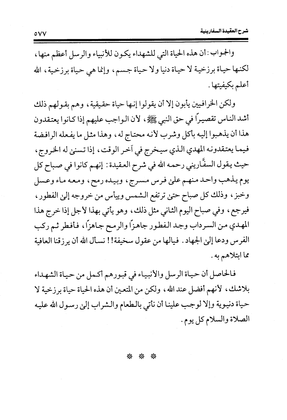 ولكن الخرافيين يأبون إلا أن يقولوا إنها حياة حقيقية، وهم بقولهم ذلك أشد الناس تقصيراً في حق النبي صلى الله عليه وسلم، لأن الواجب عليهم إذا كانوا يعتقدون هذا أن يذهبوا إليه بأكل وشرب لأنه محتاج له، وهذا مثل ما يفعله الرافضة فيما يعتقدونه المهدي الذي سيخرج في آخر الوقت، إذا تسنى له الخروج، حيث يقول السفاريني رحمه الله في شرح العقيدة: إنهم كانوا في صباح كل يوم يذهب واحد منهم على فرس مسرج، وبيده رمح، ومعه ماء وعسل وخبز، وذلك كل صباح حتى ترتفع الشمس وييأس من خروجه إلى الفطور، فيرجع، وفي صباح اليوم الثاني مثل ذلك، وهو يأتي بهذا لأجل إذا خرج هذا المهدي من السرداب وجد الفطور جاهزاً والرمح جاهزاً، فأفطر ثم ركب الفرس ودعا إلى الجهاد. فيا لها من عقول سخيفة نسأل الله أن يرزقنا العافية مما ابتلاهم به.