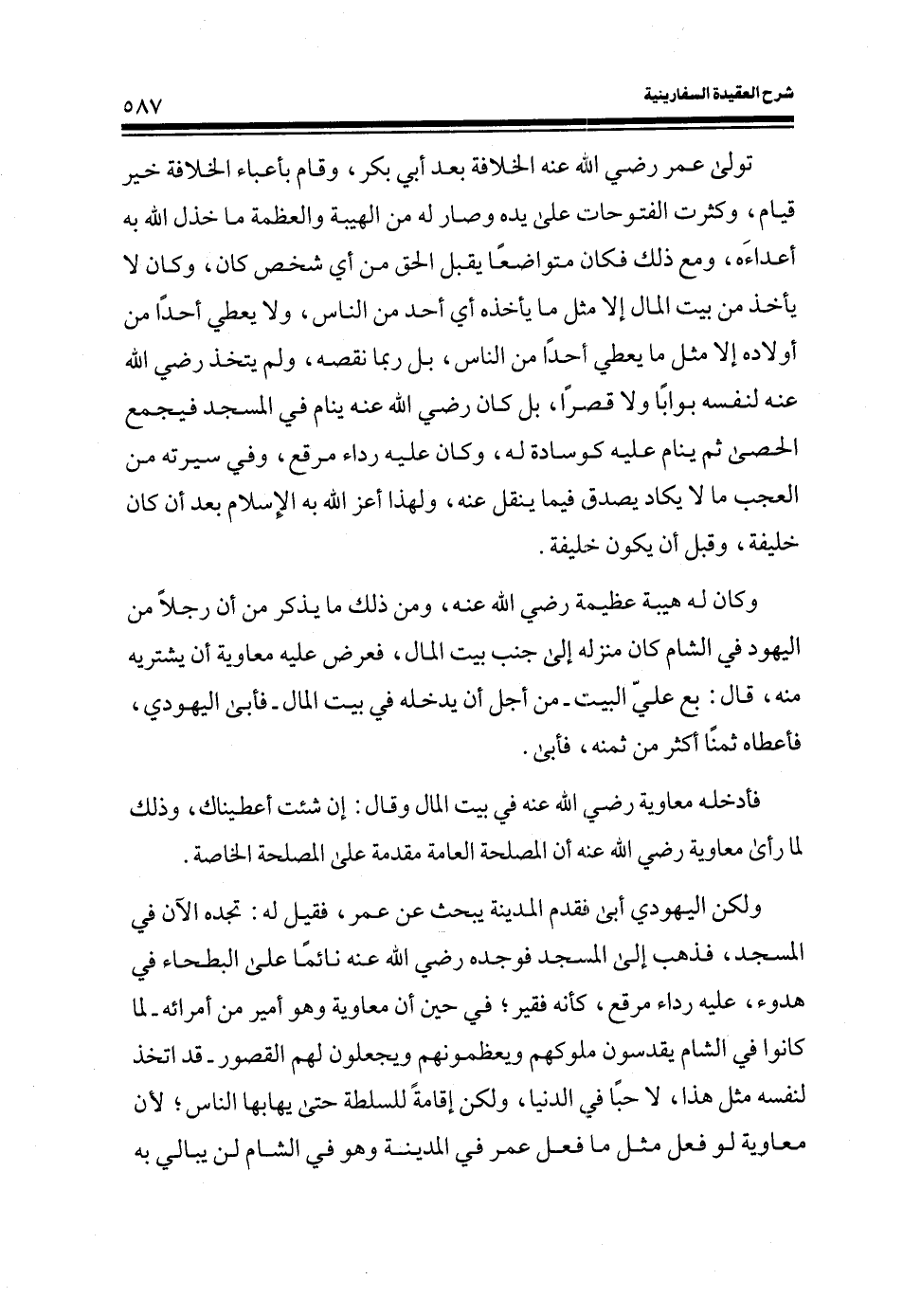 ولكن اليهودي أبى فقدم المدينة يبحث عن عمر، فقيل له: تجده الآن في المسجد، فذهب إلى المسجد فوجده رضي الله عنه نائماً على البطحاء في هدوء، عليه رداء مرقع، كأنه فقير؛ في حين أن معاوية وهو أمير من أمرائه - لما كانوا في الشام يقدسون ملوكهم ويعظمونهم ويجعلون لهم القصور - قد اتخذ لنفسه مثل هذا، لا حباً في الدنيا، ولكن إقامة للسلطة حتى يهابها الناس؛ لأن معاوية لو فعل مثل ما فعل عمر في المدينة وهو في الشام لن يبالي به