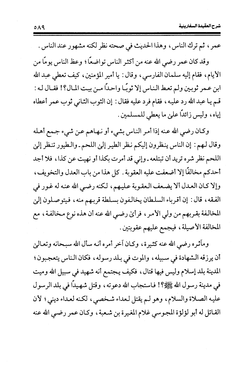 وقد كان عمر رضي الله عنه من أكثر الناس تواضعاً؛ وعظ الناس يوماً من الأيام، فقام إليه سلمان الفارسي، وقال: يا أمير المؤمنين، كيف تعطي عبد الله ابن عمر ثوبين ولم تعط الناس إلا ثوباً واحداً من بيت المال؟ فقال له: قم يا عبد الله رد عليه، فقام فرد عليه فقال: إن الثوب الثاني ثوب عمر أعطاه إياه، وليس زائدا على ما يعطي للمسلمين.