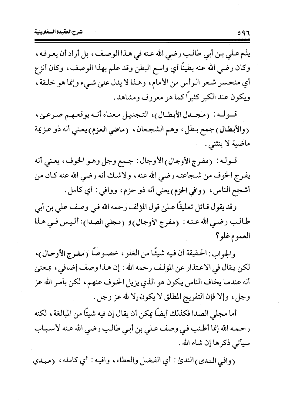 وقد يقول قائل تعليقاً على قول المؤلف رحمه الله في وصف علي بن أبي طالب رضي الله عنه: (مفرج الأوجال) و (مجلي الصدا) : أليس في هذا العموم غلو؟