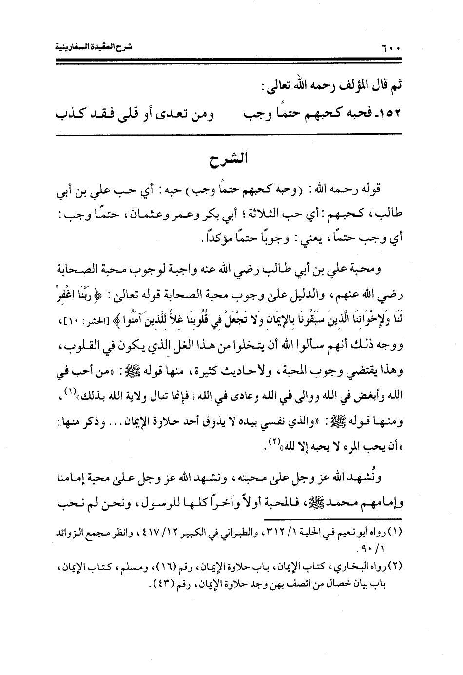 ومحبة علي بن أبي طالب رضي الله عنهم واجبة لوجوب محبة الصحابة رضي الله عنهم، والدليل على وجوب محبة الصحابة قوله تعالى: (رَبَّنَا اغْفِرْ لَنَا وَلِإِخْوَانِنَا الَّذِينَ سَبَقُونَا بِالإيمَانِ وَلا تَجْعَلْ فِي قُلُوبِنَا غِلّاً لِلَّذِينَ آمَنُوا) (الحشر: الآية10) ووجه ذلك أنهم سألوا الله أن يتخلوا من هذا الغل الذي يكون في القلوب، وهذا يقتضي وجوب المحبة، ولأحاديث كثيرة، منها قوله صلى الله عليه وسلم: ((من أحب في الله وابغض في الله ووالى في الله وعادى في الله؛ فإنما تنال ولاية الله بذلك)) (¬1) ، ومنها قوله صلى الله عليه وسلم: ((والذي نفسي بيده لا يذوق أحد حلاوة الإيمان.. وذكر منها: ((أن يحب المرء لا يحبه إلا لله)) (¬2) .