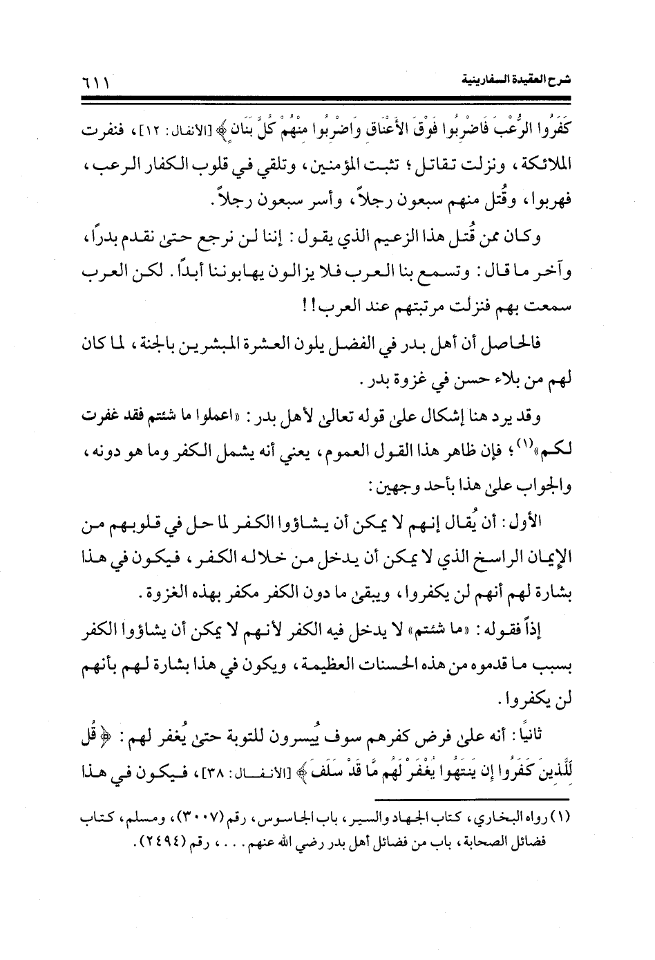 وقد يرد هنا إشكال على قوله تعالى لأهل بدر: (اعملوا ما شئتم فقد غفرت لكم) (¬1) ؛ فإن ظاهر هذا القول العموم، يعني أنه يشمل الكفر وما هو دونه، والجواب على هذا بأحد وجهين: