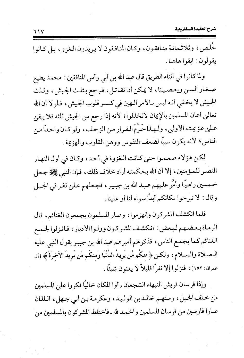 ولما كانوا في أثناء الطريق قال عبد الله بن أُبي رأس المنافقين: محمد يطيع صغار السن ويعصينا، لا يمكن أن نقاتل، فرجع بثلث الجيش، وثلث الجيش لا يخفي أنه ليس بالأمر الهين في كسرة قلوب الجيش، فلولا أن الله تعالى أعان المسلمين بالإيمان لانخذلوا؛ لأنه إذا رجع من الجيش ثلثه فلا يبقى على عزيمته الأولى، ولهذا حرم الفرار من الزحف، ولو كان واحداً من الناس؛ لأنه يكون سبباً لضعف النفوس ووهن القلوب والهزيمة.