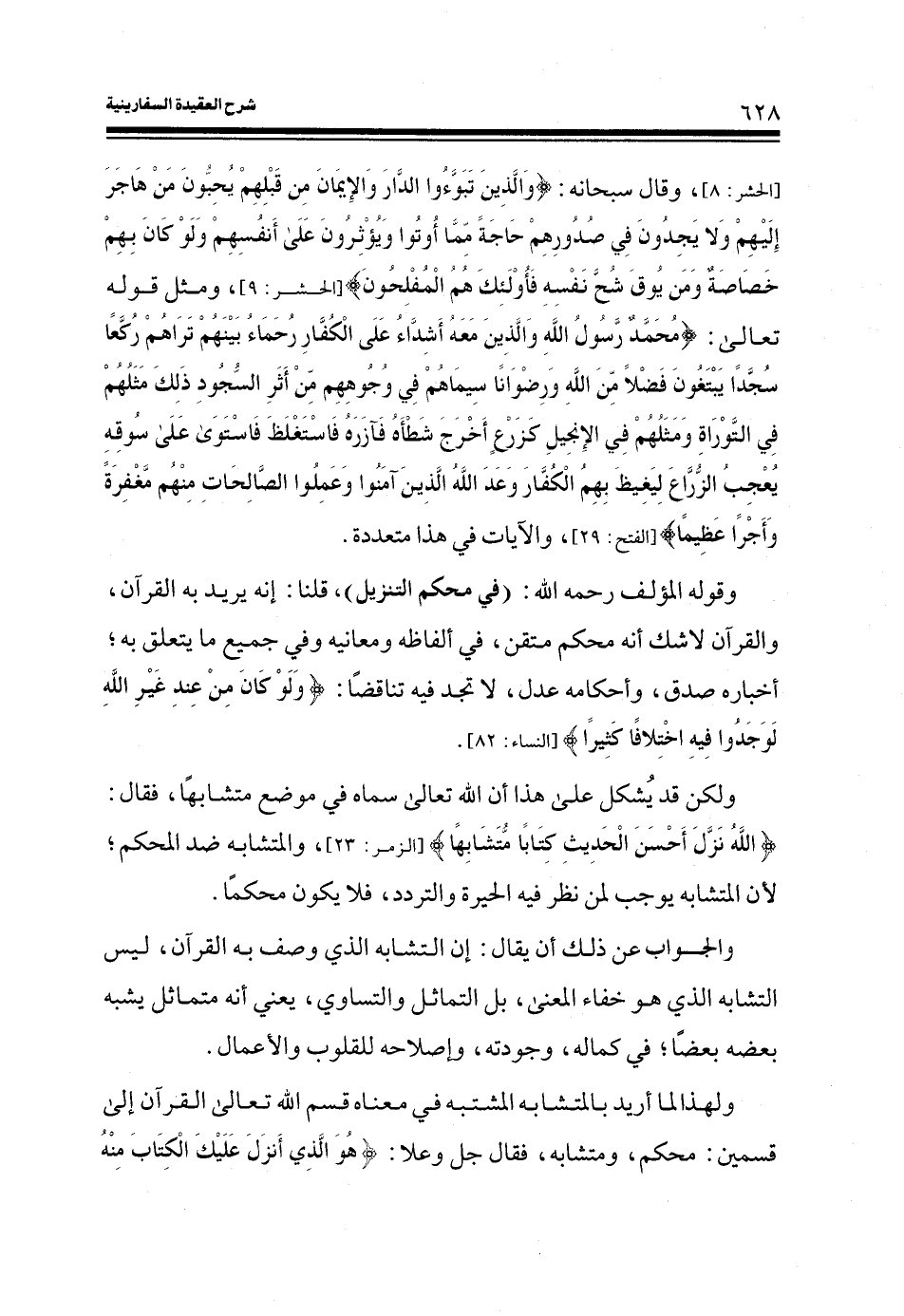 ولكن قد يشكل على هذا أن الله تعالى سماه في موضع متشابها، فقال: (اللَّهُ نَزَّلَ أَحْسَنَ الْحَدِيثِ كِتَاباً مُتَشَابِهاً) (الزمر: الآية23) ، والمتشابه ضد المحكم؛ لأن المتشابه يوجب لمن نظر فيه الحيرة والتردد، فلا يكون محكما.