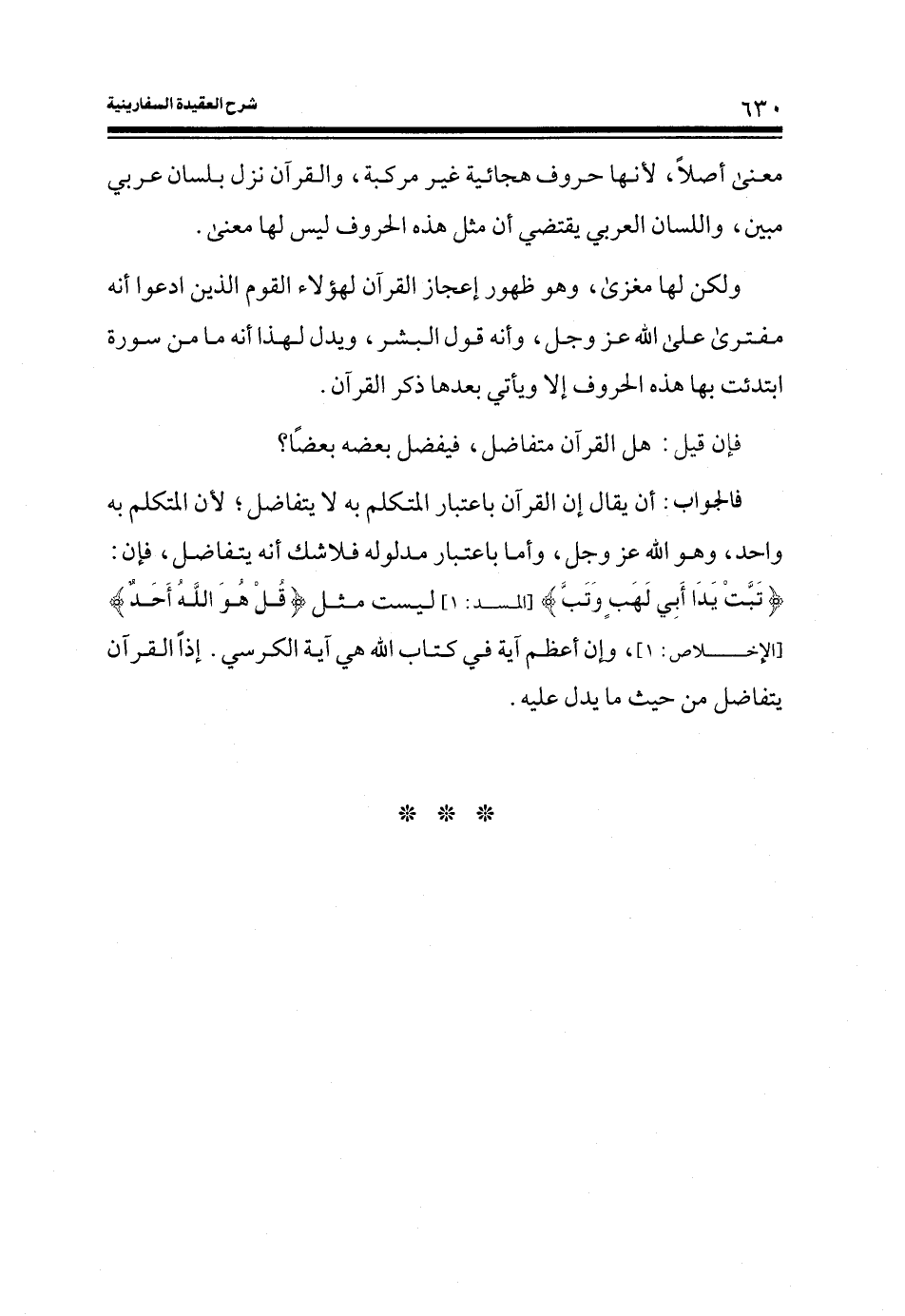 فالجواب: أن يقال إن القرآن باعتبار المتكلم به لا يتفاضل؛ لأن المتكلم به واحد، وهو الله عز وجل، وأما باعتبار مدلوله لا شك انه يتفاضل، فإن: (تَبَّتْ يَدَا أَبِي لَهَبٍ وَتَبَّ) (المسد: 1) ليست مثل (قُلْ هُوَ اللَّهُ أَحَدٌ) (الإخلاص: 1) ، وإن أعظم آية في كتاب الله هي آية الكرسي. إذاً القرآن يتفاضل من حيث ما يدل عليه.